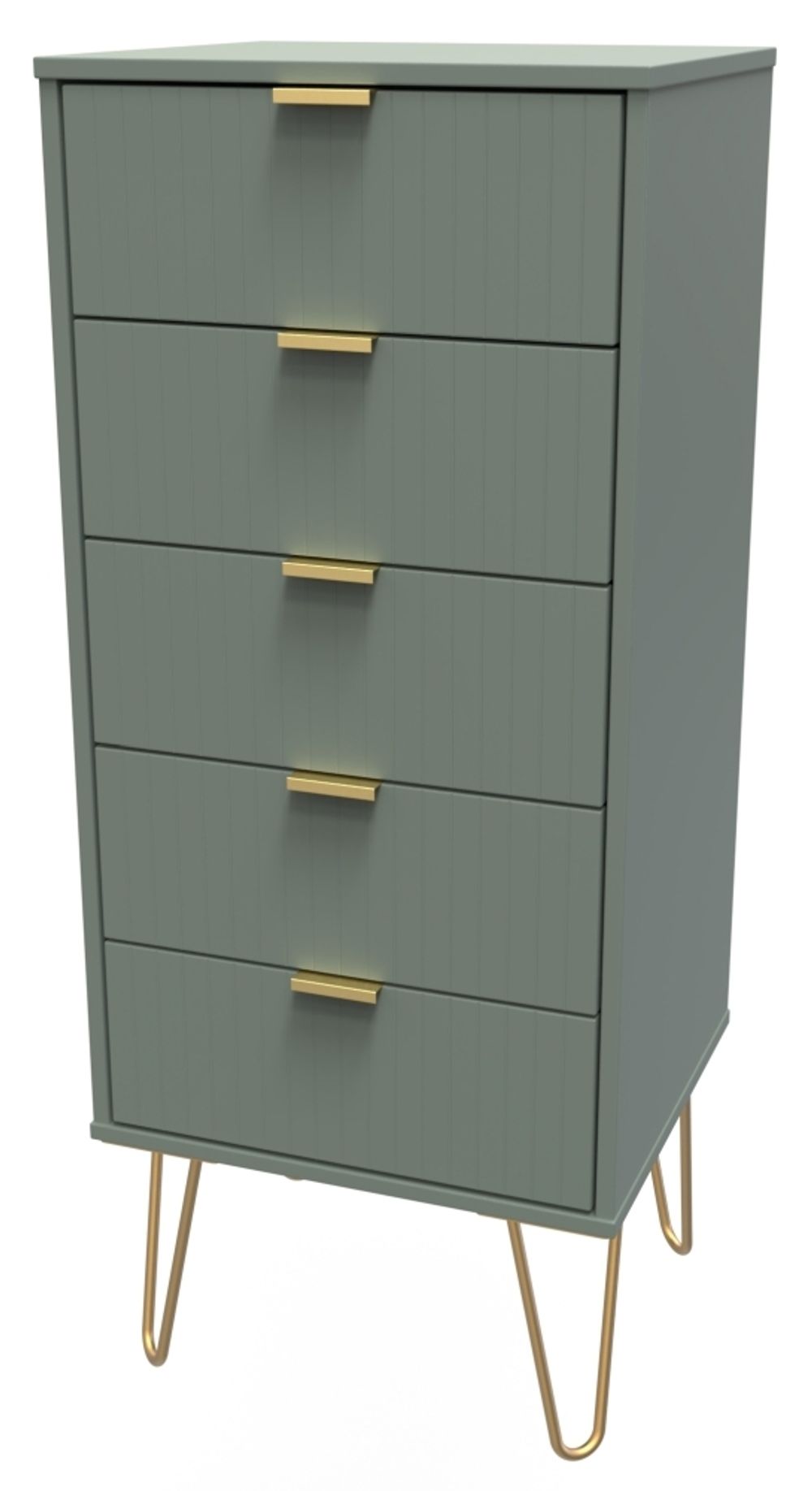 Item Code: LIF003RG This beautiful, modern cabinet with 5 drawers is perfect for any bedroom, hallway or living space. It is constructed with durable particle wood and finished in a stylish reed green colour for a subtle, eye catching appearance. Hairpin legs keep it sturdy and stable, providing extra style and elegance. Its tall design allows you to store longer items with ease. A functional and stylish addition to any home.