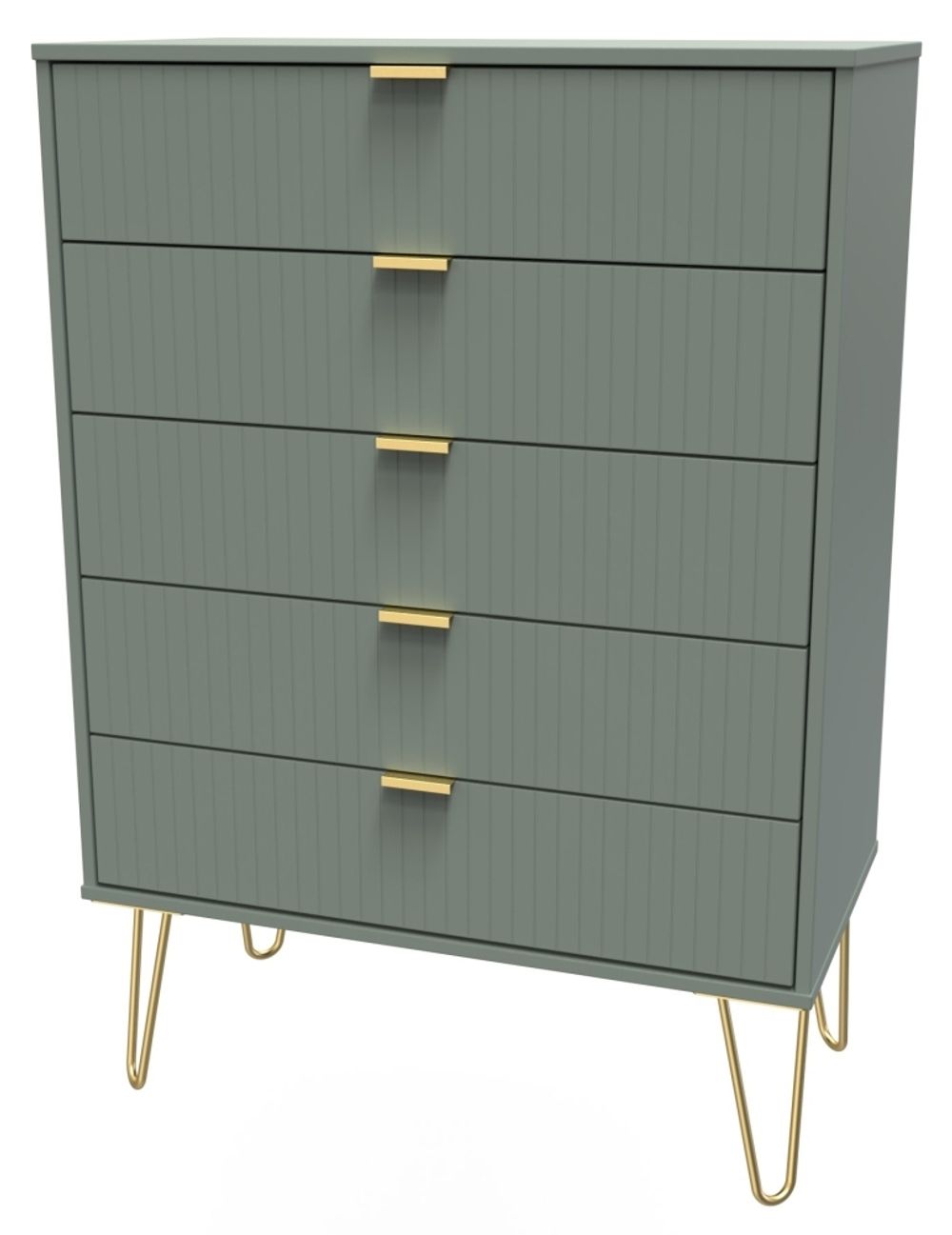 Item Code: LIF012RG This stylish five drawer chest is just what you need for your bedroom. With its reed green finish and hairpin legs, it embodies sophistication and elegance. Particle wood structure ensures durability. Includes five drawers fit for holding clothing, jewelry, and accessories. Perfect for adding convenient storage to your home.