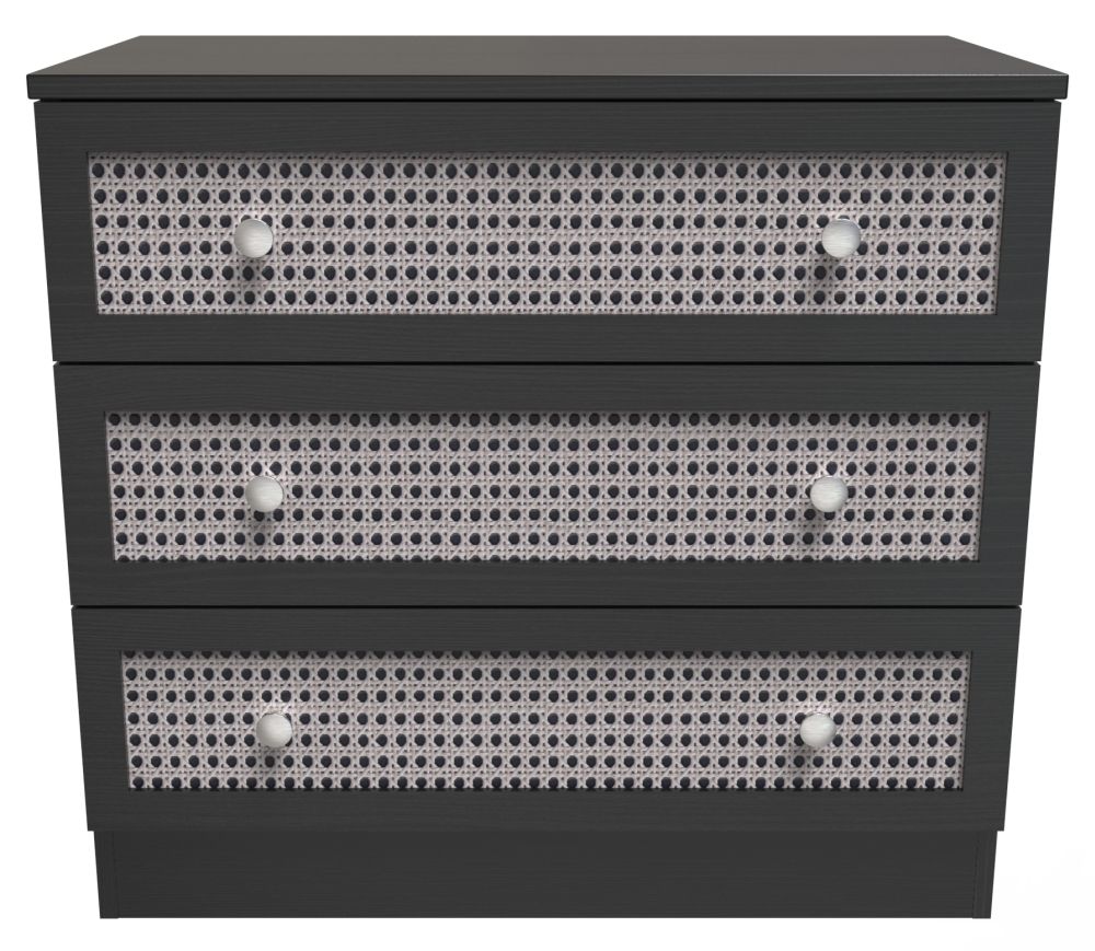 Item Code: RAT010B This stylish 3 drawer chest is made with particle wood and rattan for a unique look. With a beautiful black ash finish, it adds a sleek and modern touch to any bedroom or living room space. The drawers provide ample storage to keep items neat and organized. Easy assemble with minimal effort required, this eye-catching chest is sure to impress.