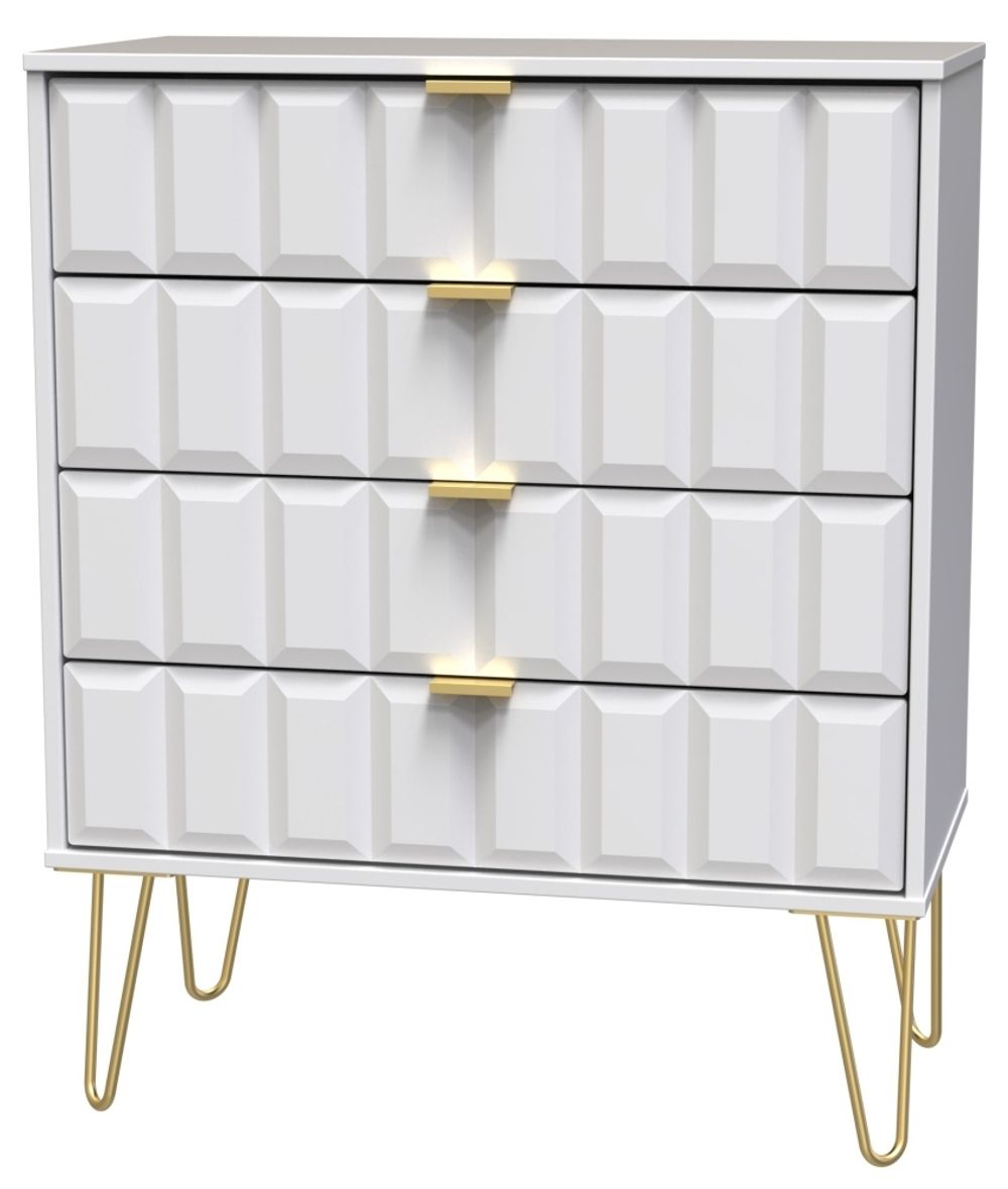Item Code: CUF011WM This 4 drawer chest is perfect for any bedroom! Crafted from particle wood, it's finished with a white matt for a modern look. Featuring stylish hairpin legs, it also comes fully assembled, so no worries about putting it together. Ideal for storing clothing, books, or other belongings, this chest is the ideal storage solution.