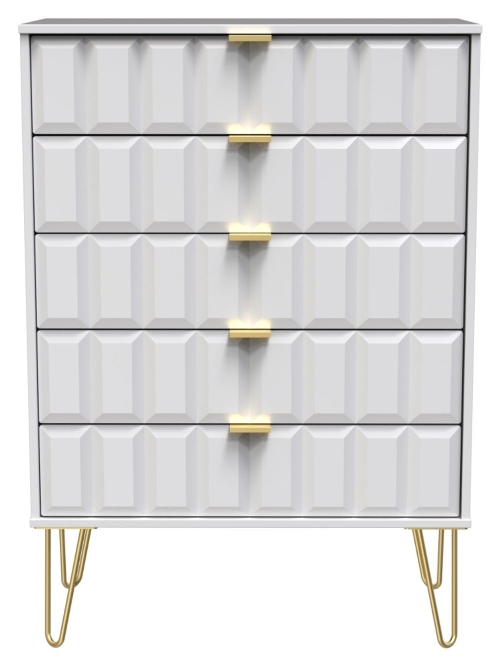 This stunning 5 drawer chest is made of particle wood and finished with white matt. Perfectly designed with hairpin legs for a modern look, it adds style and sophistication to your home. With ample storage space, it is ideal for organizing your clothes and accessories. Get this beautiful addition for your bedroom today!