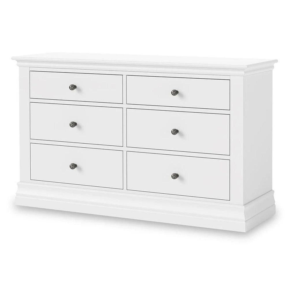 The Bordeaux White 6 Drawer Wide Chest is the perfect combination of practicality and refined design. Choose this piece to bring enduring craftsmanship, style, and functional storage to your home.