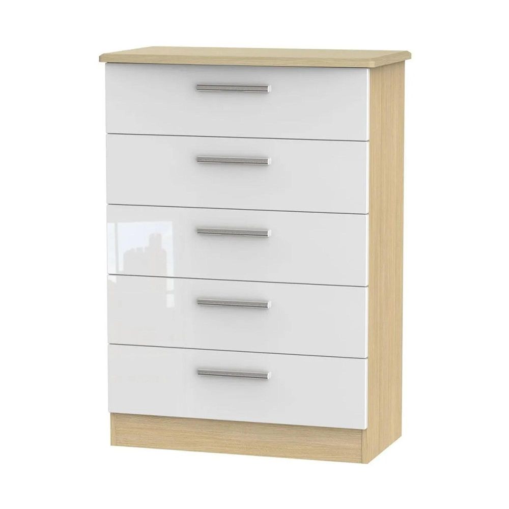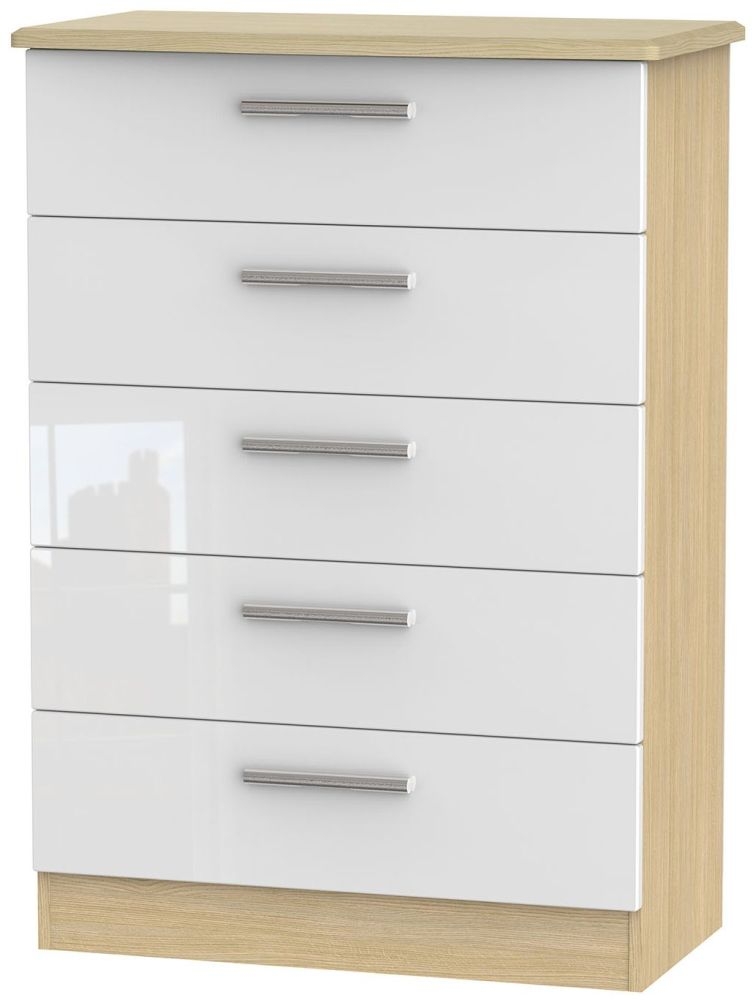 Knightsbridge White Gloss and Light Oak 5 Drawer Chest
