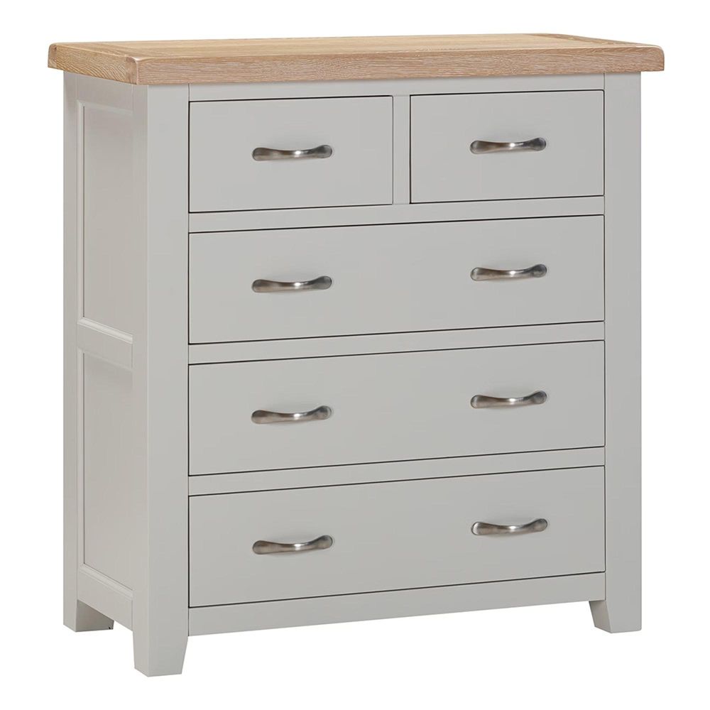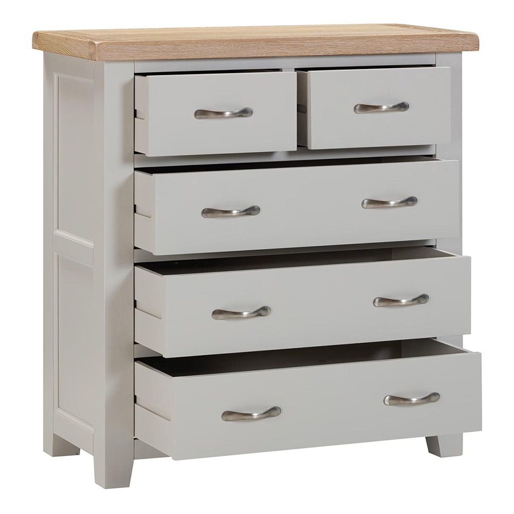 The chest features two smaller top drawers, perfect for keeping smaller items neatly organised, alongside three spacious lower drawers designed for clothing, linens, or everyday essentials. Each drawer is built with traditional dovetail joints, ensuring long-lasting durability and smooth use over time. Metal pull handles in a brushed finish complete the look, balancing practicality with understated elegance.
