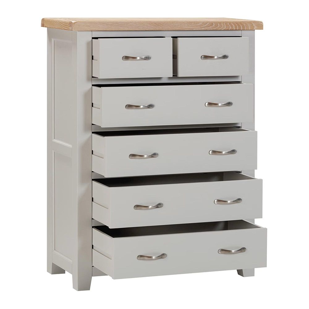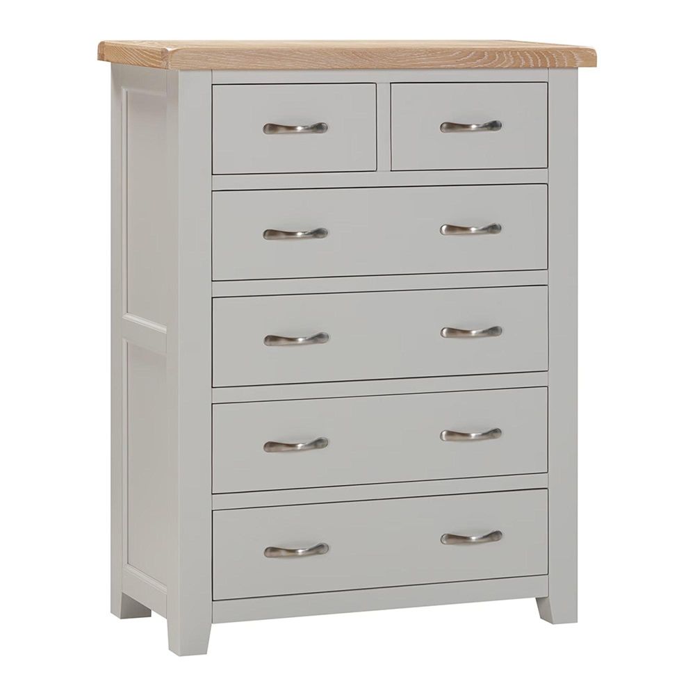 The chest features a pale oak top with softly rounded edges, adding depth and character to its painted base. Six spacious dovetailed drawers—two smaller at the top and four generously sized below—provide ample storage for both clothing and household essentials. Complete with durable metal pull handles, this chest is built to last while maintaining its refined appearance.
