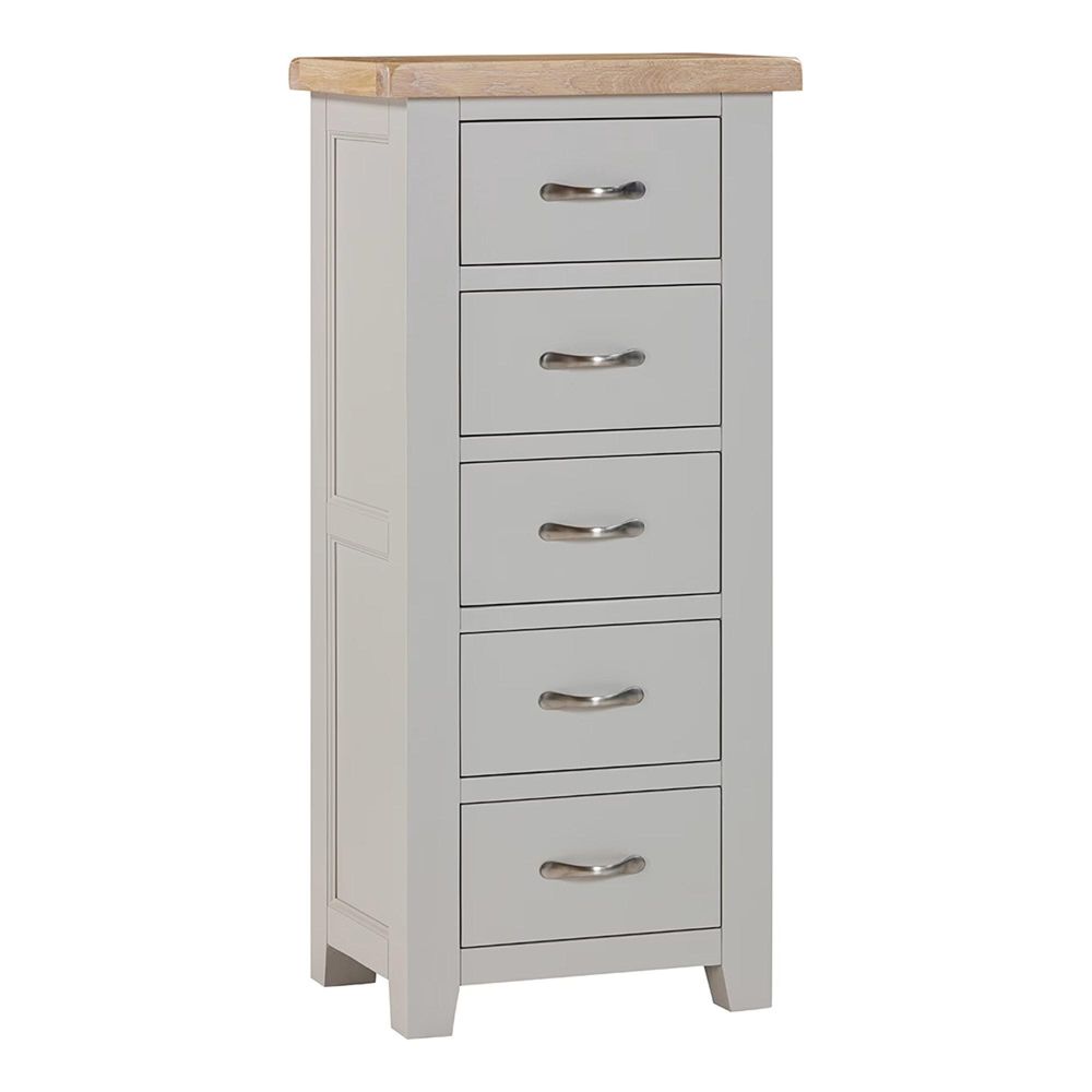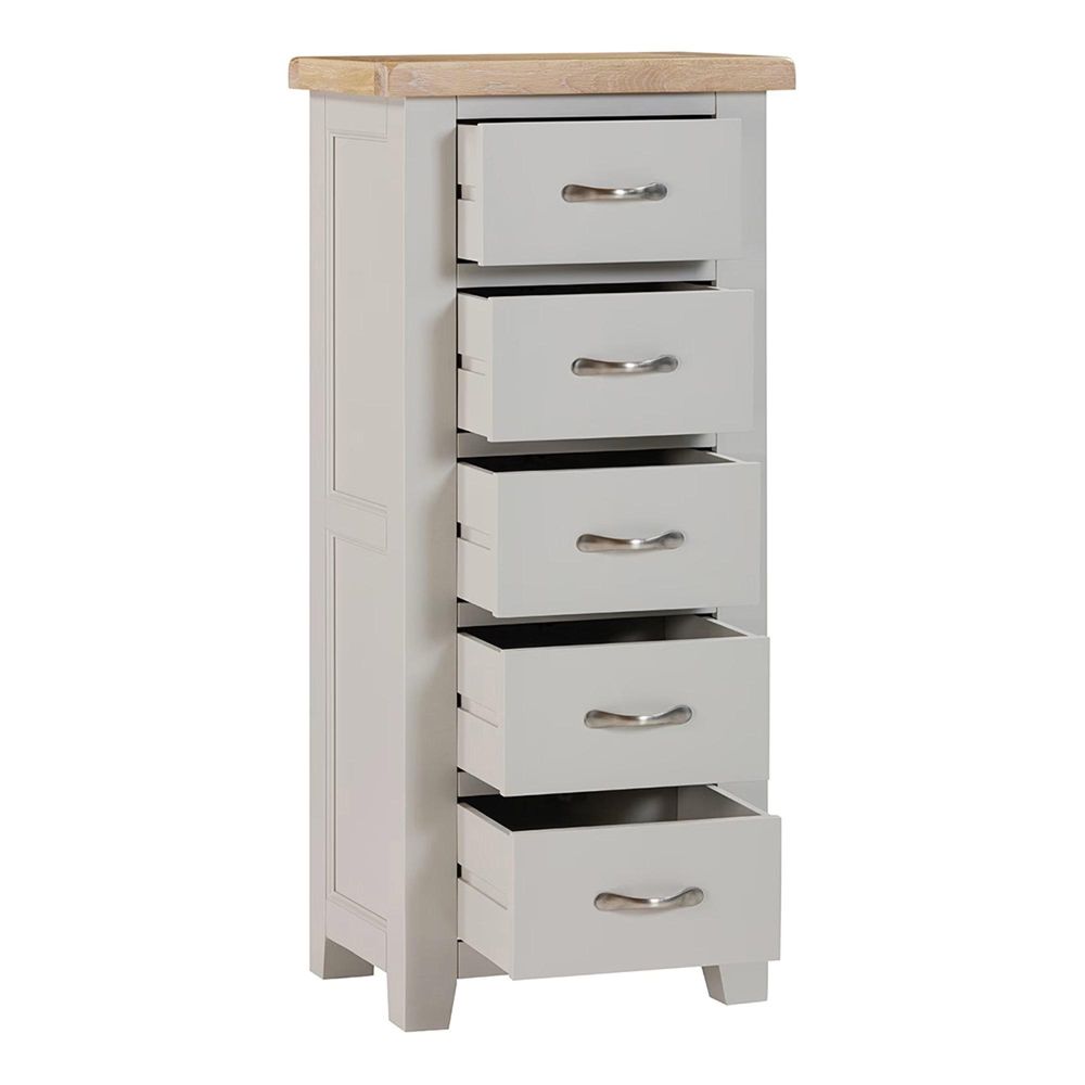 The Wilmont Grey Painted 5 Drawer Narrow Chest is designed for homes that value both practicality and timeless style. Finished in a soft grey paint with a pale oak top, this tall and slim storage piece fits effortlessly into bedrooms of any size, offering an elegant solution where floor space is limited. Its refined design in neutral tones makes it a versatile addition to both classic and modern interiors.