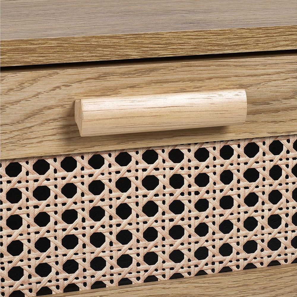 Item Code: SYD004 A beautifully sleek design with a bohemian feell, the Sydney 6 Drawer Wide Chest offers exquisitely curved edging accompanied by a raised lip around the edge providing a practical addition, stunningly combined with a rattan-styled front. Finished with a natural oak effect featuring six wide drawers providing the ideal storage space for any bedding or clothing items plus extra space on top for ornaments to be placed. Creating the perfect airy, warm feel within your home.