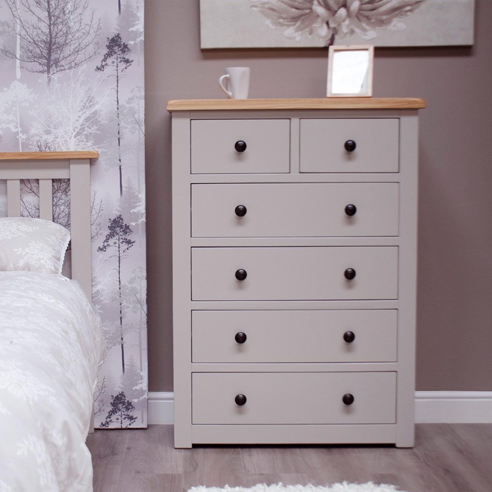 Crafted with precision and designed for timeless appeal, the Diamond Painted 4+2 Drawer Chest combines solid oak construction with a refined grey painted finish. This chest offers a harmonious blend of style, durability, and functionality, making it a versatile addition to any bedroom, dressing area, or living space. Every detail, from the lacquered oak top to the exposed hinges, reflects careful craftsmanship, ensuring that it is both a practical storage solution and a statement piece.