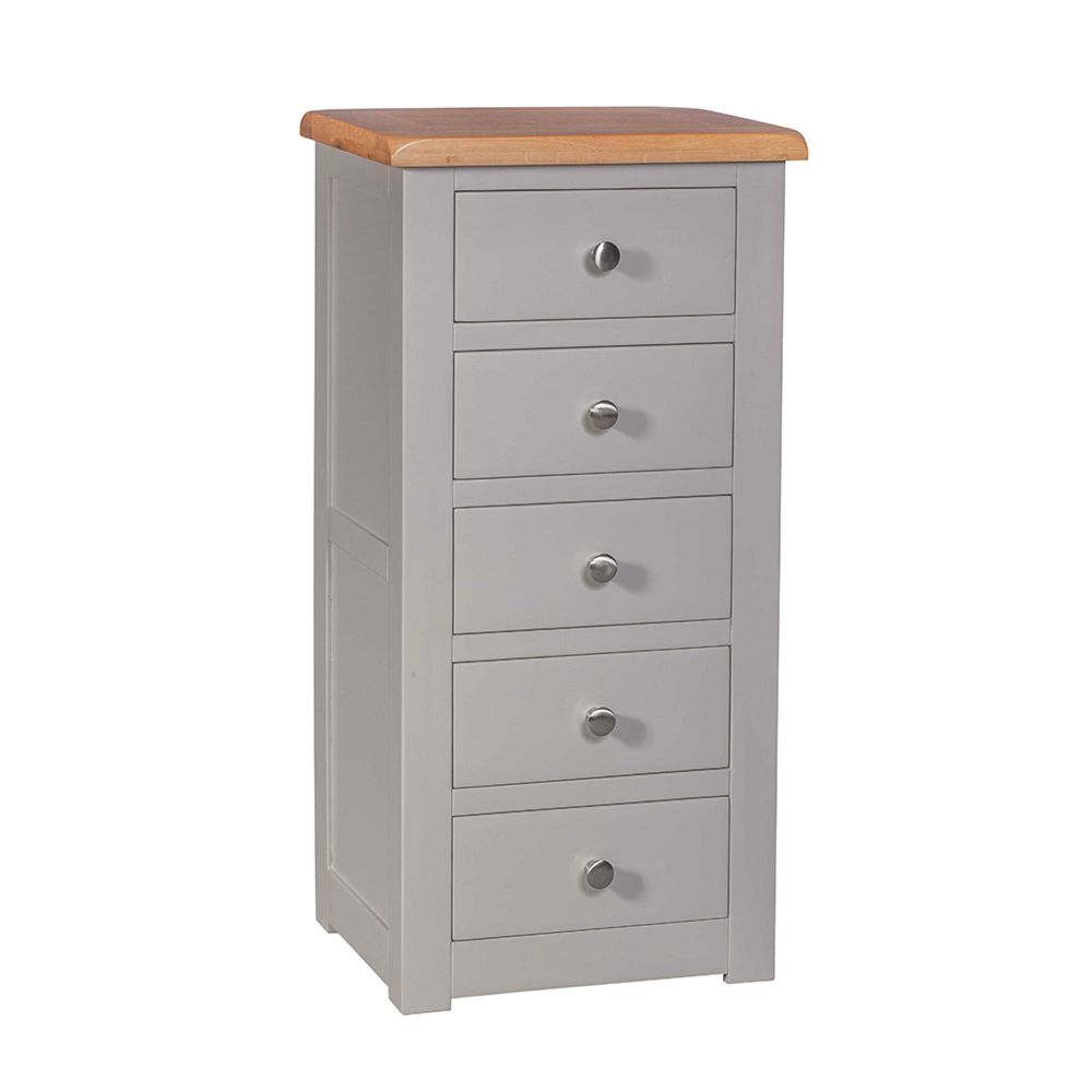 The Diamond Painted 5 Drawer Tallboy is a timeless storage solution that combines functionality with refined elegance. Crafted from solid oak and finished in a subtle grey painted tone, this tallboy brings a sense of warmth and sophistication to any bedroom or living space. Its classic design is enhanced by clean lines, exposed hinges, and a lacquered oak top, ensuring both durability and style.