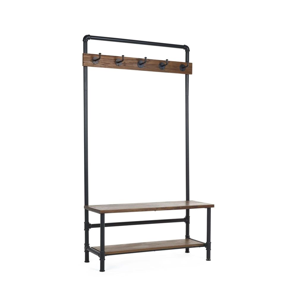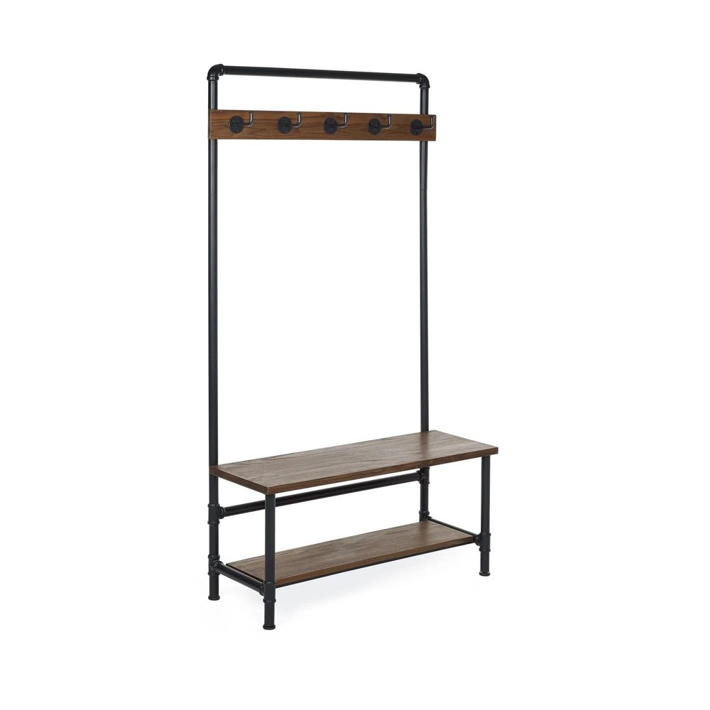 Item Code: BOS101 Make a statement in your entryway with the Boston Hallway Stand with Bench, seamlessly blending industrial design with practicality. Boasting sleek pipe legs crafted from powder coated steel for a modern touch to your home decor. With five black hooks provided, it is perfect for keeping coats and bags within easy reach. The built-in bench constructed from solid Elm wood in a luxurious mocha finish, and offers a cosy spot to sit whilst slipping on shoes, with ample storage space underneath for footwear and other essentials. Welcome guests in style with this chic and versatile addition to your home. Minimal assembly is required for your convenience.