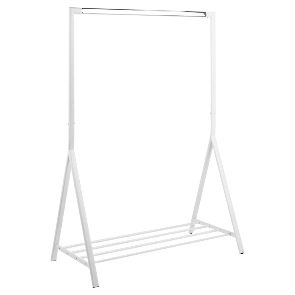 Item Code: 76660 Brent clothes rack, frame white powder coated steel and chrome steel, shelf and base white powder coated steel with clothes bar. Lacking space for closet, new clothes or you like to organize your clothes Either way, this clothing rack fits the description. It is great for organizing, displaying or planning your outfits. This one comes in white metal with chrome detail and has even a shoe rack that also keeps the stand extra steady. The clothing rack just let your clothes shine.Free Delivery
