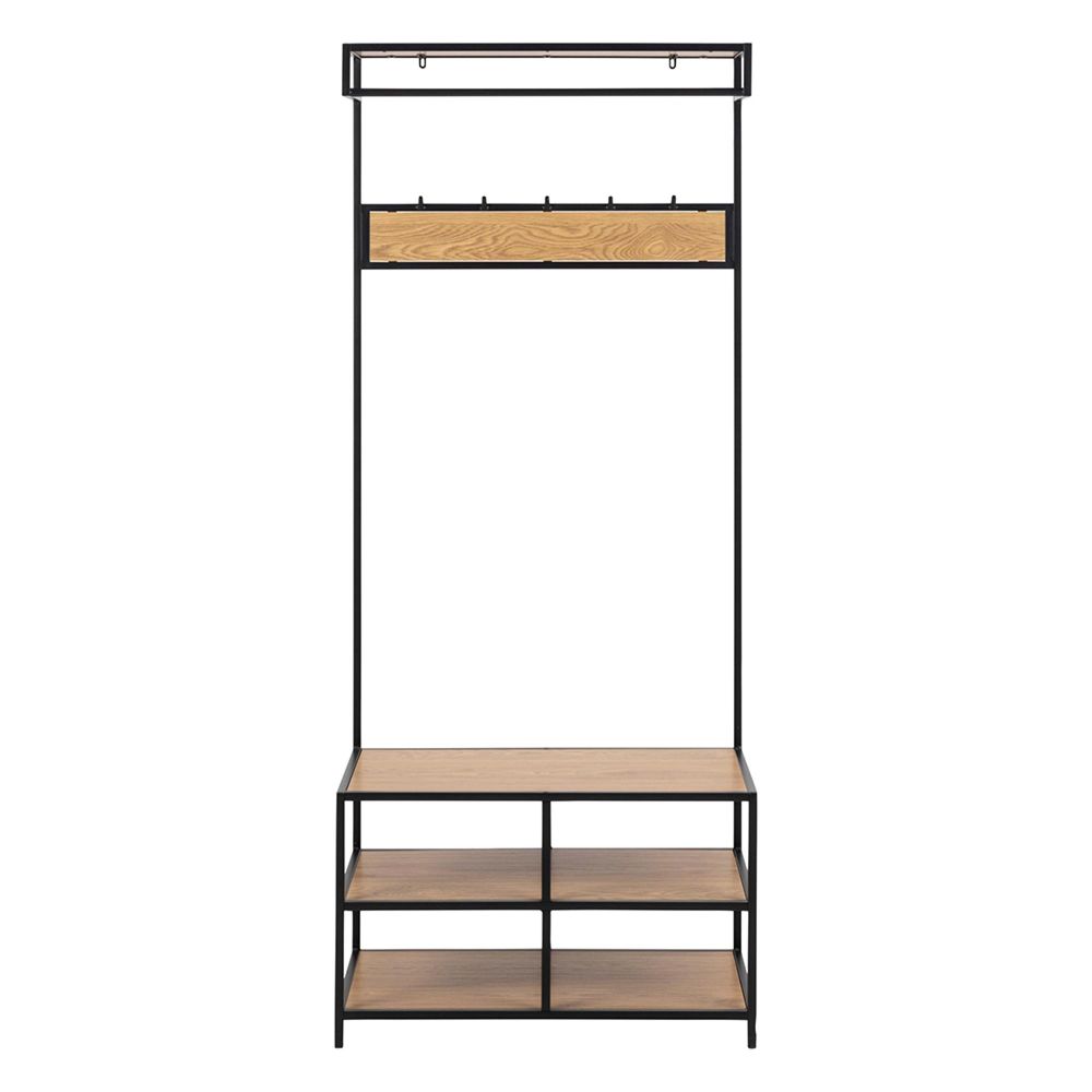 Item Code: 107913 Seaford clothes rack, frame and base matt black rough powder coated steel, 3 shelves matt wild oak rough paper. Made for entrances where space matters, this is a practical solution that blends modern and rustic aesthetic. With 2 shelves for shoes and 1 for hats and small decor, adorned in wild oak look, its offers ample storage. It is also designed with hooks for coats and jackets. The sturdy black steel frame complements the oak decor.Free Delivery
