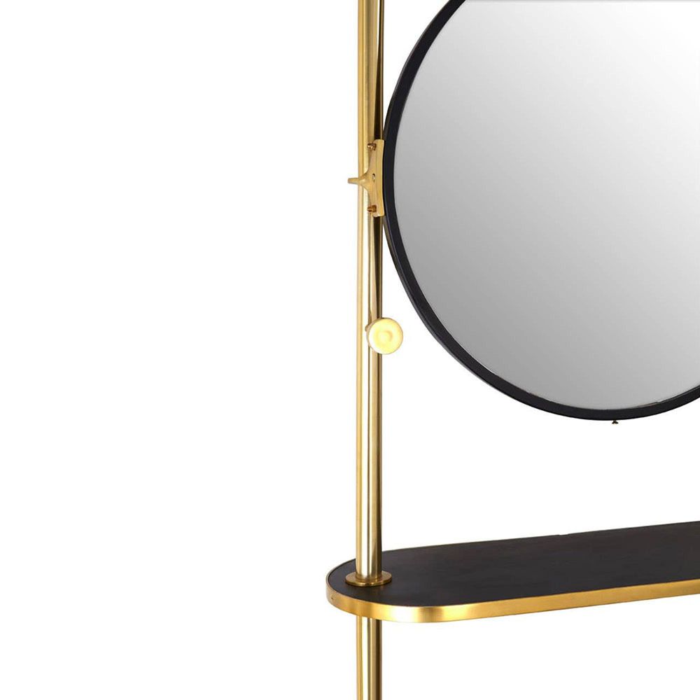 Item Code: 5502474 The stylish luxe-style Hawkes mirror stand features a large round mirror, shelves and coat hooks.This mirror stand's metal frame boasts a rich antique brass finish that creates a striking counterpoint to the black finish of the shelves. The bottom shelf is slatted, ideal for storing shoes.