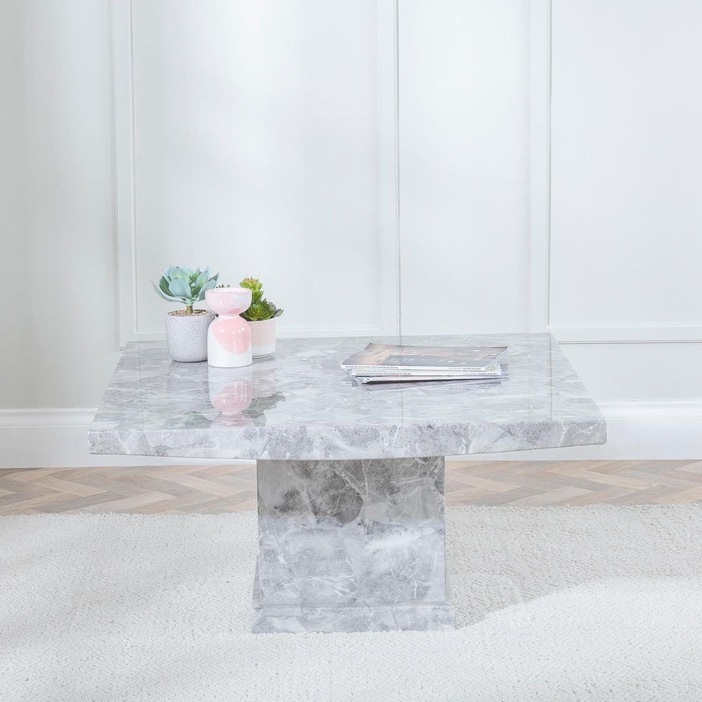 Add a touch of luxury to your living room with the Turin Grey Marble Square Coffee Table from Urban Deco. Featuring a compact square shape, this piece blends the deep elegance of polished Grey marble with clean, minimalist lines. A matching marble pedestal base completes the look, offering stability with sculptural appeal.