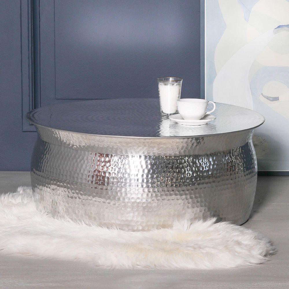 Item Code: FM22 This sleek, modern coffee table is sure to bring contemporary style to any living room. Crafted from silver aluminium with a hammered effect, it is both lightweight and durable. With no storage capabilities, this piece will add a touch of modern glamour to your home.
