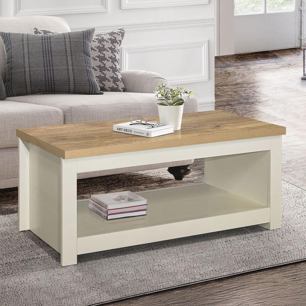 Item Code: HIGCTCRO Inspired by classic farmhouse furniture the Highgate range has been designed to complement both modern and traditional homes.The Highgate range is modern, practical, affordable furniture and with stylish silver handles looks fantastic too.Available in cream & oak, grey & oak and navy & oak this range will suite a wide array of interiors.The Highgate coffee table features a large lower shelf ideal for storage.Care instructions: Wipe carefully with a soft, dry cloth.
