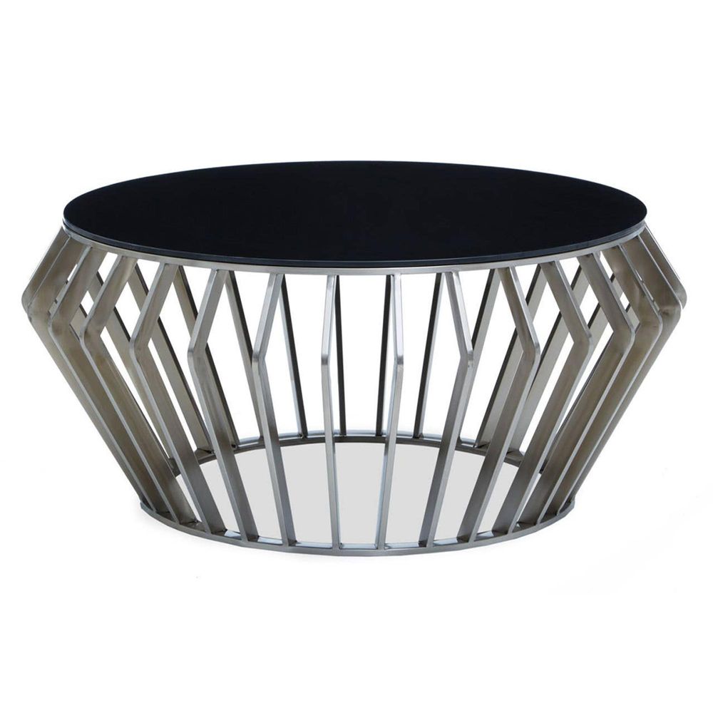 Item Code: 5527721 Ackley coffee table, with a black glass top and patterned silver frame.Make a modern statement with your decor. The Ackley coffee table has a sleek black glass top and patterned silver frame.