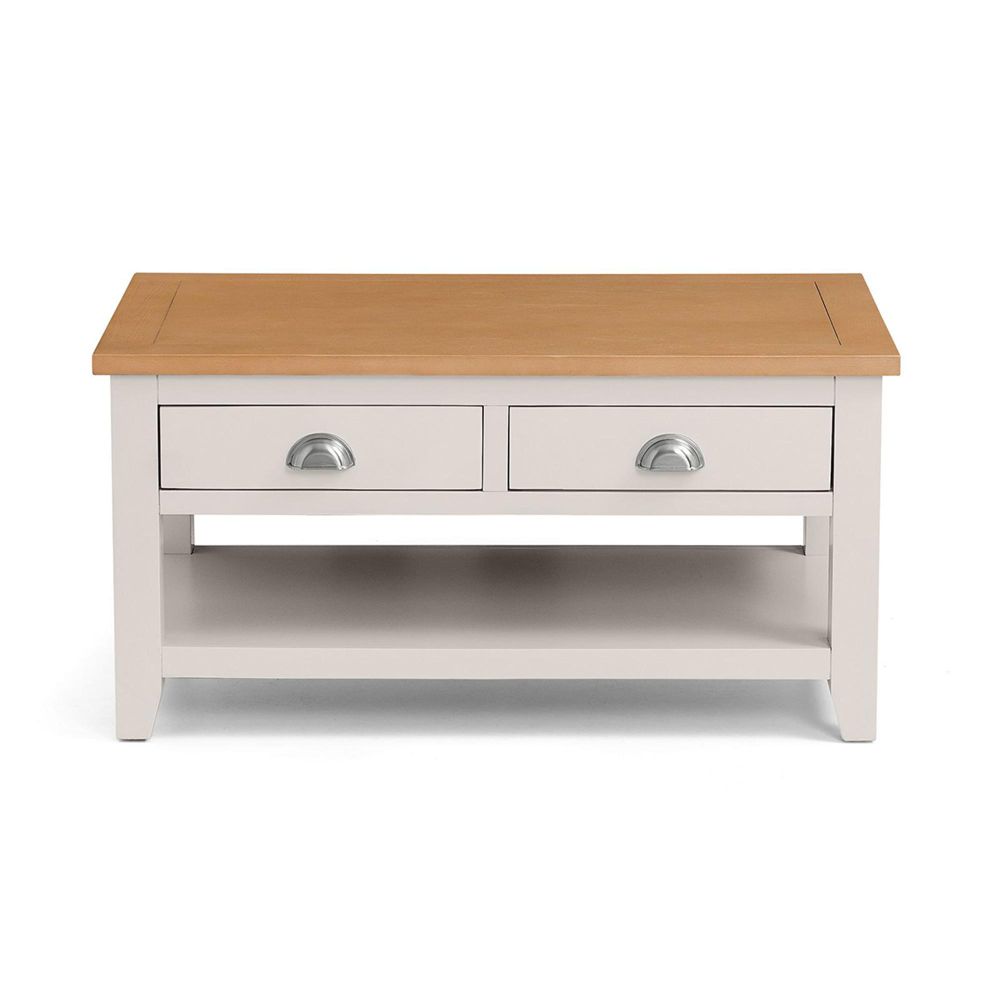 Item Code: RIC203 An elegant Coffee Table, presented in an immaculate painted, soft Elephant Grey finish with beautiful pale oak top, crafted from a combination of high grade American White Oak solids and veneers. This stylish piece offers ample storage with 2 large full depth drawers that are accessible from both sides of the table and are accented with chic cupped handles in a brushed steel finish. The combination of superior quality materials and classic design ensures a timeless appeal and fits perfectly alongside both traditional and contemporary decor. Part of the extensive Richmond Dining and Occasional furniture range from Julian Bowen.