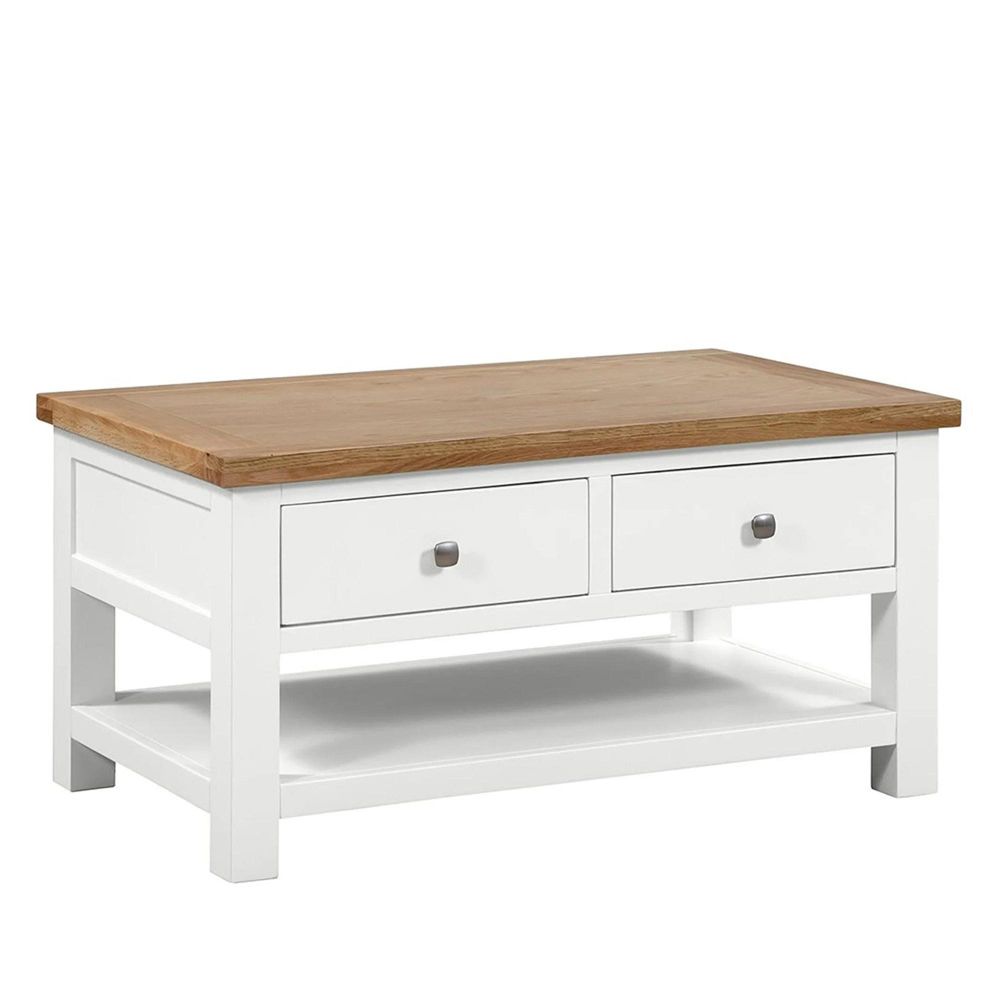 The Lundy 2 Drawer Coffee Table is a thoughtfully crafted centrepiece that balances elegant design with everyday functionality. With its clean white painted body and contrasting light oak lacquered top, this coffee table brings a fresh, refined presence to any living room.