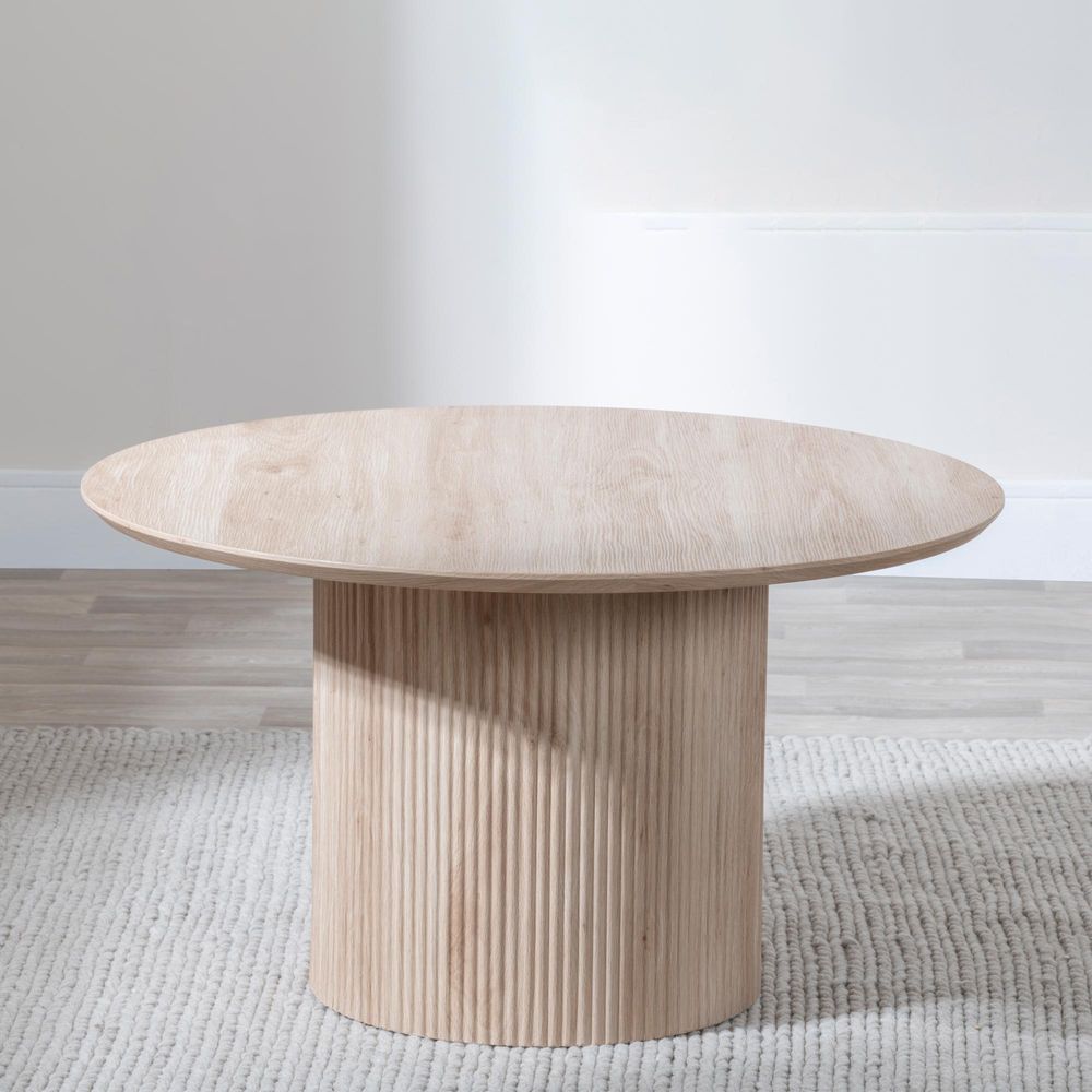 A refined centrepiece designed for modern living spaces, the Bern Fluted Round Coffee Table brings together craftsmanship, form, and practicality. With its round oak-effect top and distinctive pillar-style drum base, this piece offers a seamless balance between design and everyday function. The soft, natural tones of the wood finish lend warmth and texture to a room, while the fluted detailing on the base creates a strong sculptural presence.