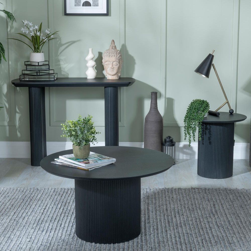 Designed with a refined modern aesthetic, the Bern Fluted Black Round Coffee Table brings sophistication and function into any living space. With a sculptural drum base and sleek round top, this coffee table is crafted for both everyday practicality and elegant presentation. Its bold black finish and distinctive fluted detailing give it a strong visual presence, making it an ideal centrepiece for modern interiors.