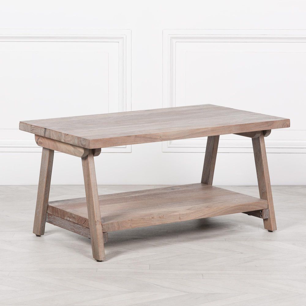 Item Code: KFA258 Acacia wood coffee table in rustic finish with A frame shaped legs and under storage