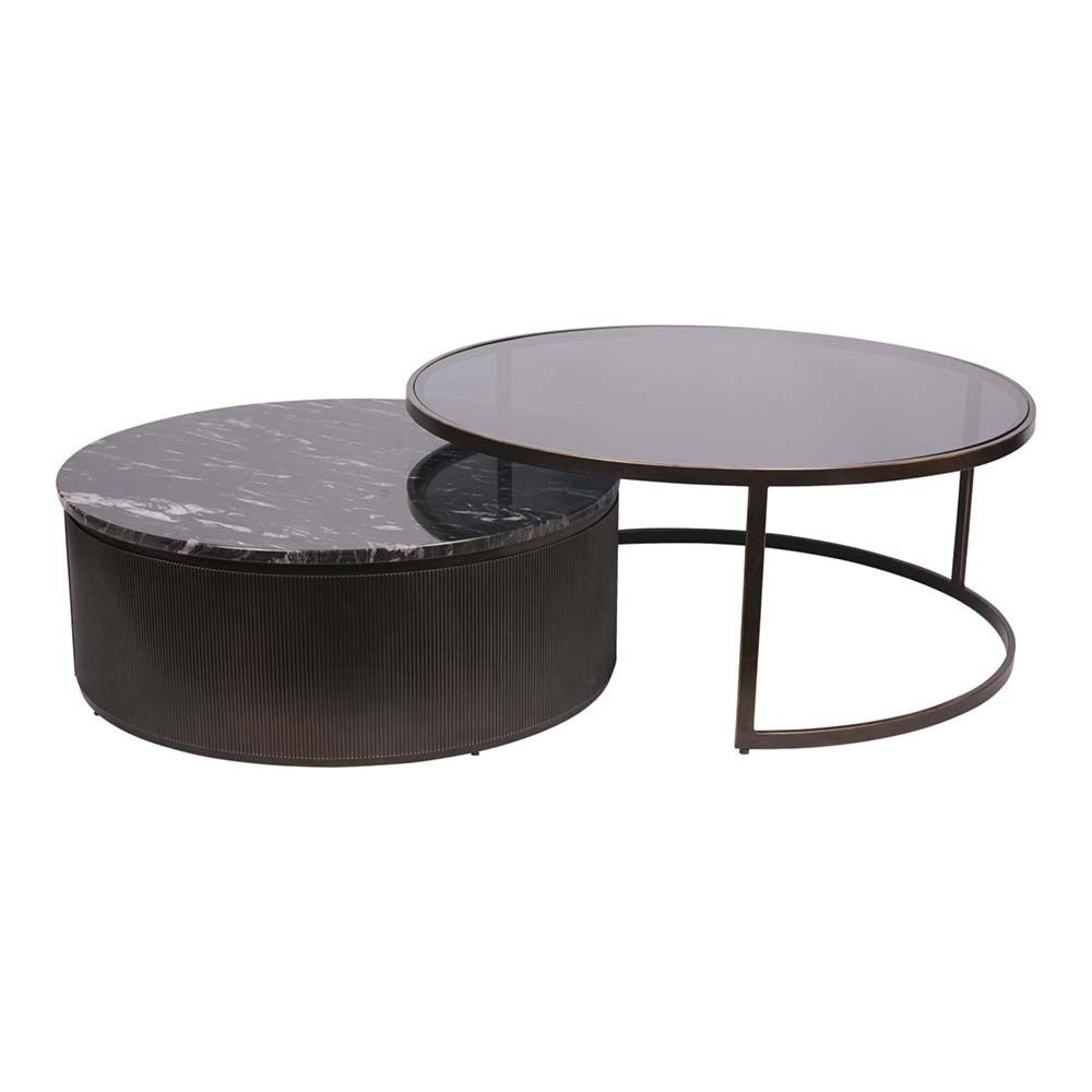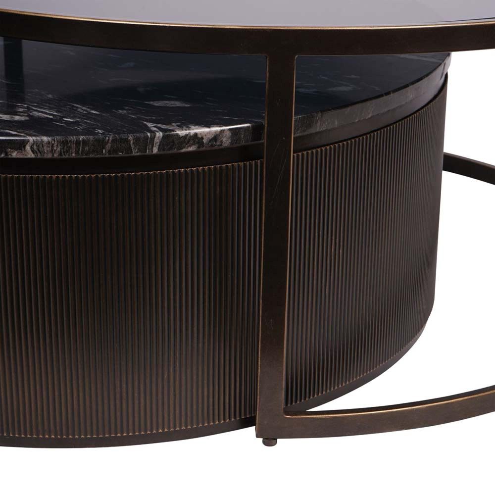 Item Code: 706162 The Belvedere Aged Black Set of Two Nesting Coffee Tables embodies contemporary, space-saving design at its finest. These stunning tables feature smooth gilded dark bronze frames, black tinted glass, and beautiful Markino Marble. The natural materials used ensure that each piece is unique and gold is used in highlights to contrast against the black tones. Marble tops will feature individual veining patterns and varied colour hues, while the iron bases may have slight texture variations. These characteristics enhance the charm and individuality of your furniture, guaranteeing that no two products are exactly alike. The Belvedere Aged Black range also includes a side table and a console. Additionally, a larger collection is available in Aged Gold.