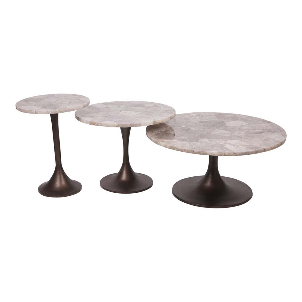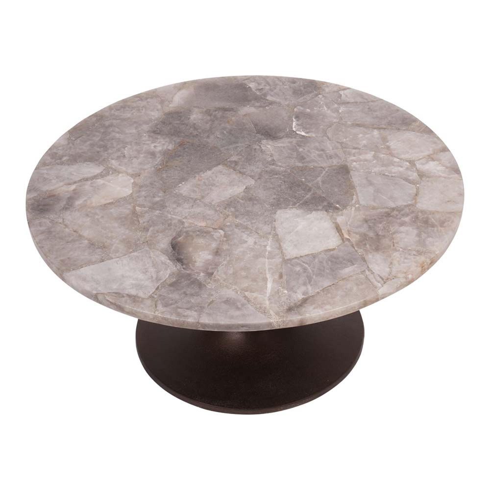 Item Code: 706244 The Bosworth Smokey Quartz Round Coffee Table showcases a stunning fusion of Smokey grey quartz, a type of agate, creating a unique and sophisticated. The quartz rests on a round aluminium base finished in antique brass. This elegant piece effortlessly blends luxury and modernity, making it a perfectly versatile addition to any space. The Bosworth collection is available in side tables in 42 cm and 60 cm sizes, as well as an 80 cm coffee table.