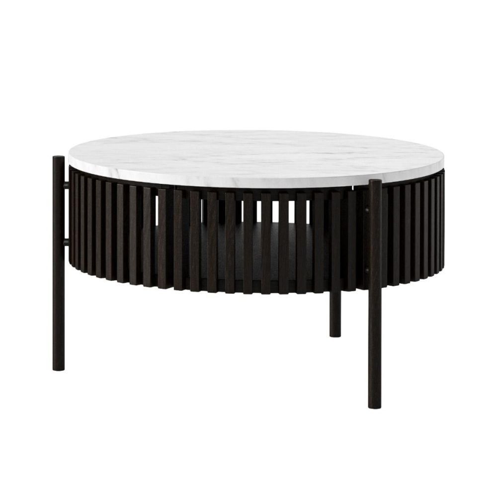 The Soho Black 1 Door Slatted Story Round Coffee Table is a stylish combination of modern design and practical functionality. Crafted from premium oak and oak veneers, it features a sleek black finish that enhances the wood’s natural texture, complemented by a smooth white marble top with subtle grey veining for a sophisticated touch.