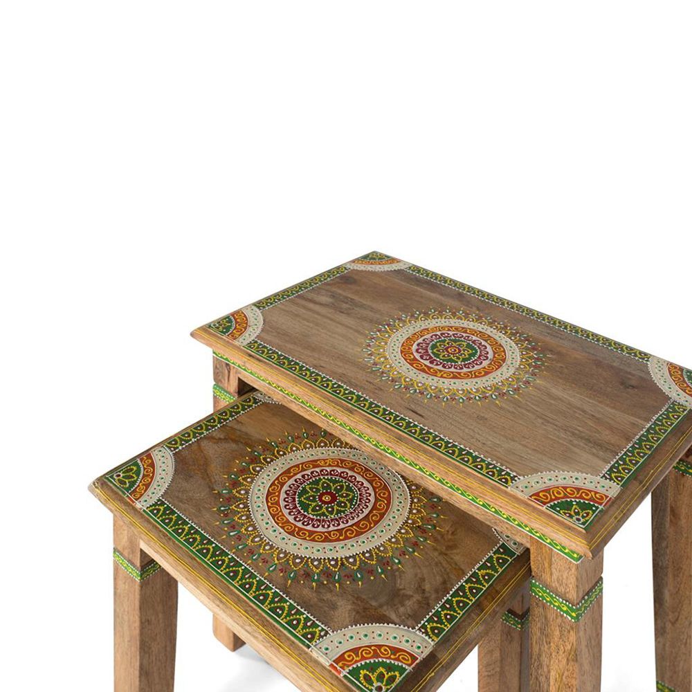Set of 2 nesting tables made of mango wood, hand painted. As it is natural wood, it can come with its original knots and grains.
