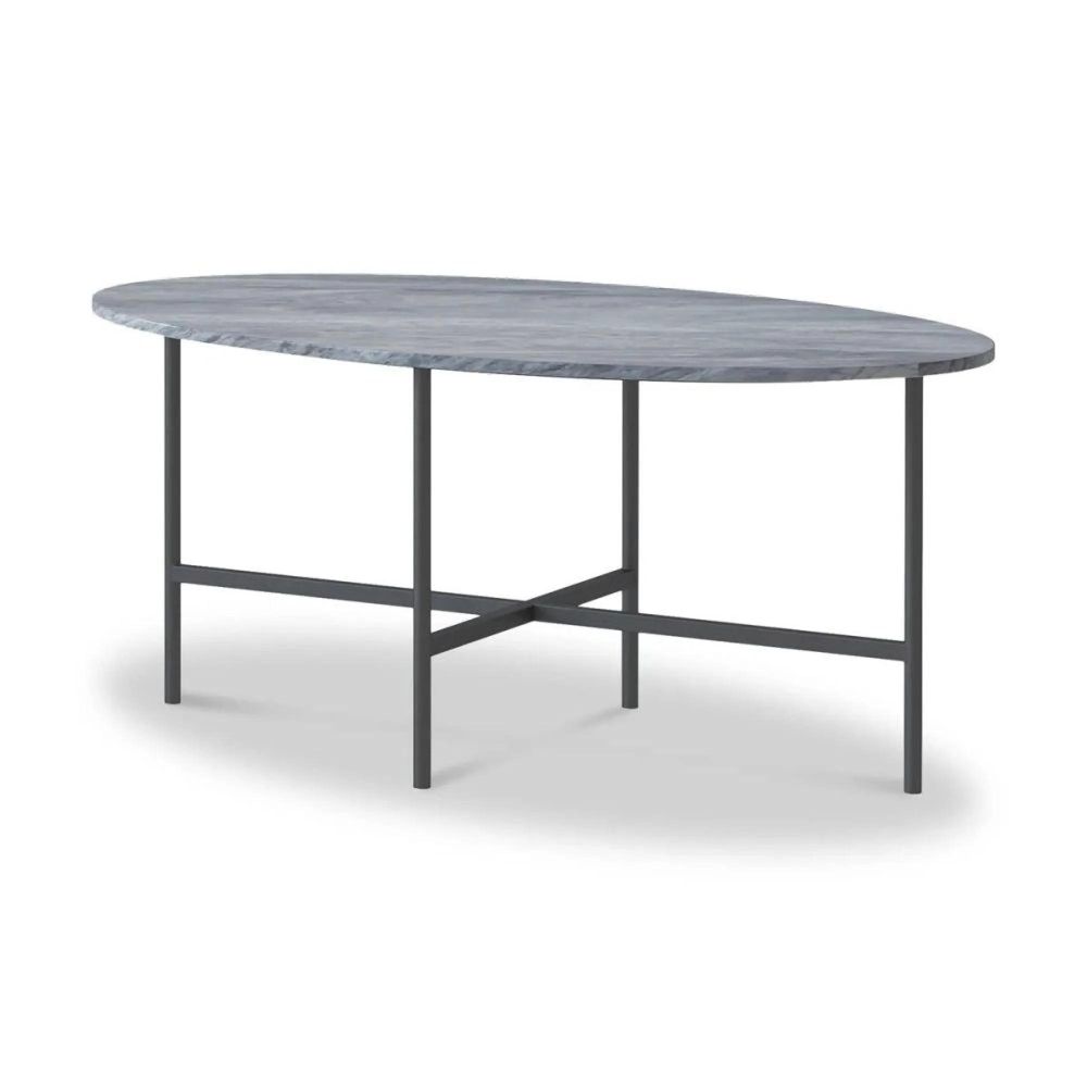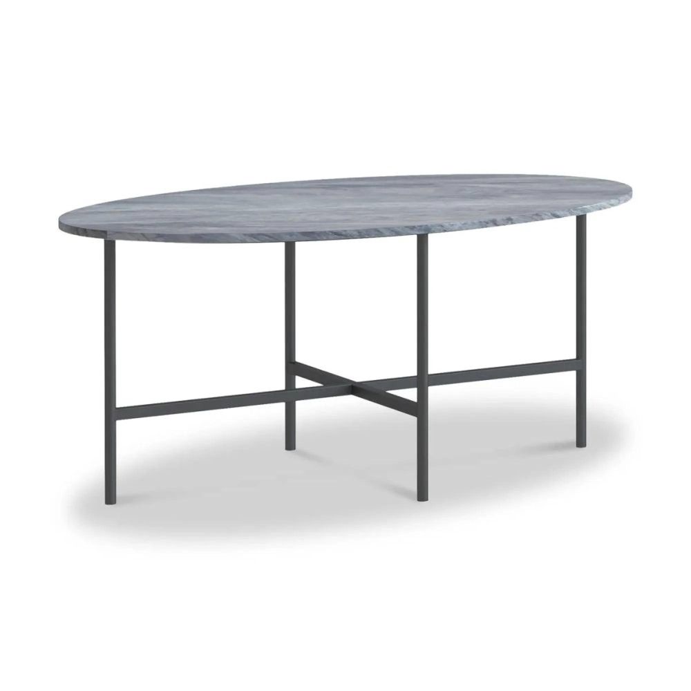 Supported by a durable cross-base metal frame in a powder-coated grey finish, this oval coffee table combines strength with sleek, contemporary style. The heat-resistant marble surface makes it practical for everyday use—perfect for drinks, décor, or entertaining guests.