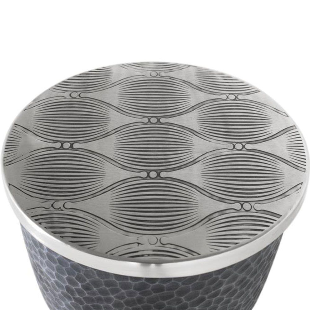 Item Code: 2166 Round Coffee Table With A Stylish Design That Combines Modernity And Craftsmanship. The Aluminum-Colored Metal Top Stands Out With Its Engravings, Creating An Organic And Elegant Pattern. The Metal Base, Also Made Of Metal, Features A Black Finish With A Hammered Design That Adds Texture And A Rustic Character. The Interplay Between The Engravings On The Top And Base Creates A Harmonious Contrast.