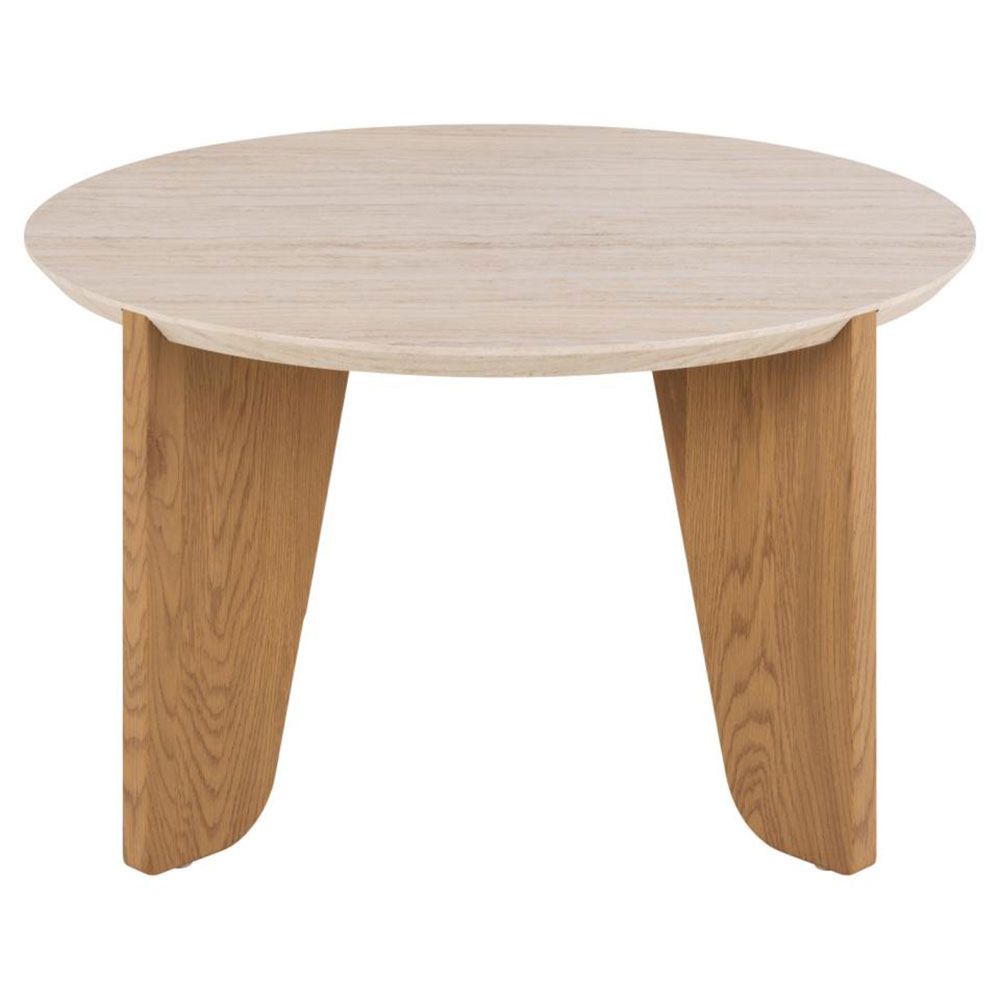 Dockland round coffee table, top travertine rough paper, base matt wild oak rough paper, 80x80x45 cmCrafted to become the statement piece in modern living rooms, this round coffee table combines travertine look with a wild oak look the winning pair that exudes modern elegance. The table design plays with shapes, featuring a round top and cut legs with smooth, rounded edges for a striking aesthetic.