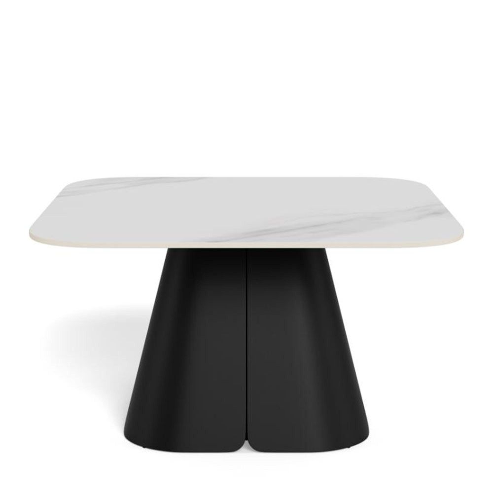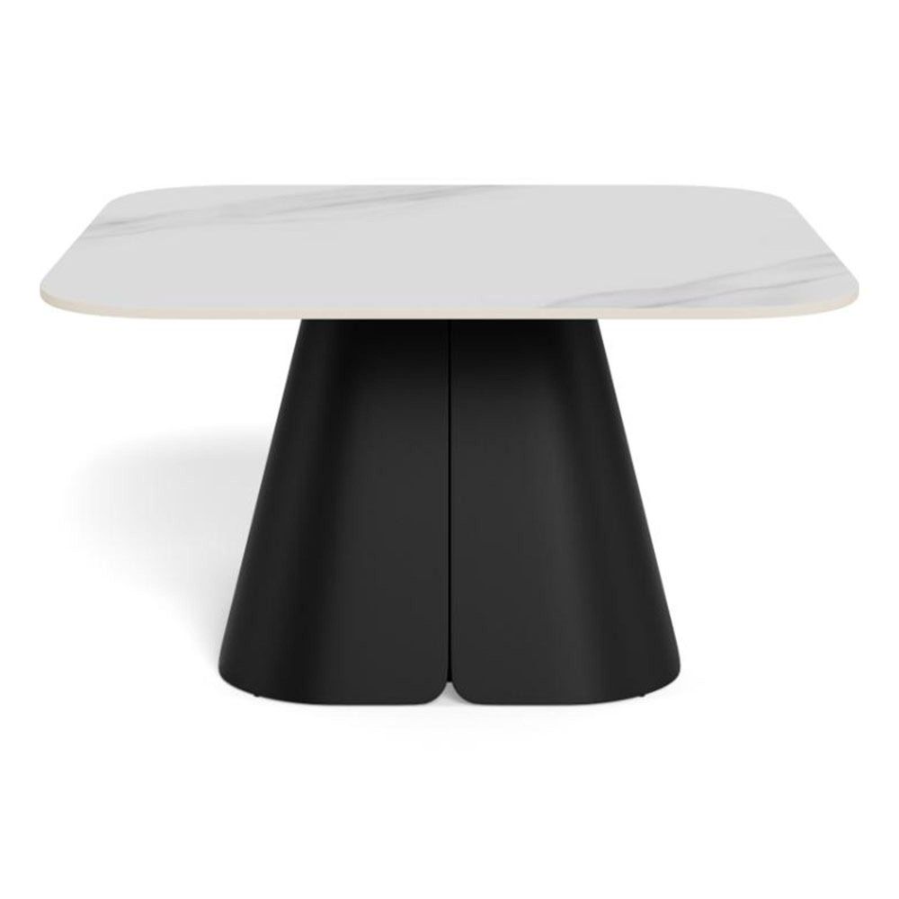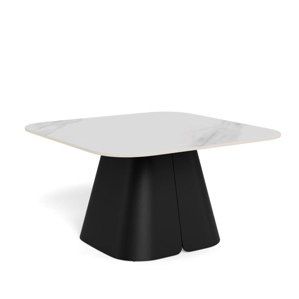 Salinas square coffee table, top white Unico rough ceramic, pillar base matt black rough powder coated steel, 80x80x45 cmBuilt on contrast, this coffee table features a square white top with rounded corners, sitting on a black pillar. The slim top is made of ceramic - a heat and scratch-resistant material, adorned with subtle veins. With a robust pillar base made of black steel, the table has a solid foundation. It is a piece for those, who appreciate bold, expressive design.