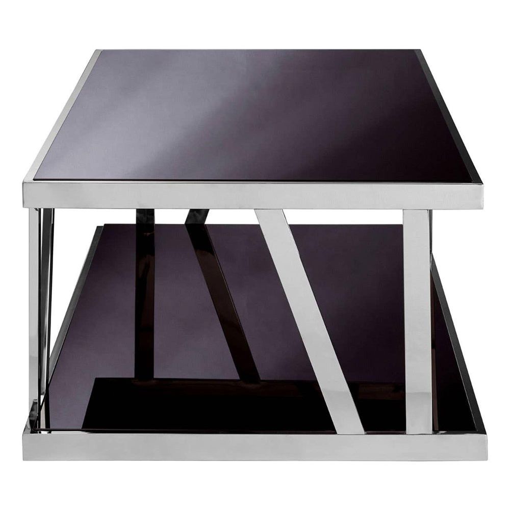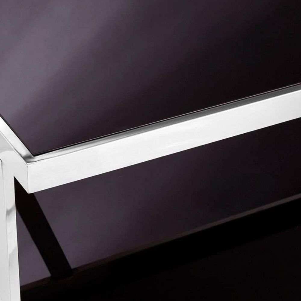 Item Code: 2405428 The contemporary Ackley coffee table is topped with luxurious black tempered glass.Its frame is made from smooth stainless steel and has a reflective chrome finish. Sleek lines separate both tiers at angles that juxtapose the frame's straight plane. Both surface areas are made from tough tempered glass, coloured black to offer a stark contrast to the silver. Coordinate it with luxe furniture.