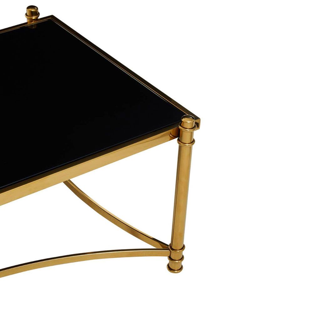 Item Code: 5527702 The coffee table features a seamless frame with decorative corners which create a modern Art Deco appearance.With sleek lines and complementary materials, this coffee table will add sparkle and style to living room decor. Its warm metallic stainless steel slender legs with stretcher base neatly hold an elegant black glass top.