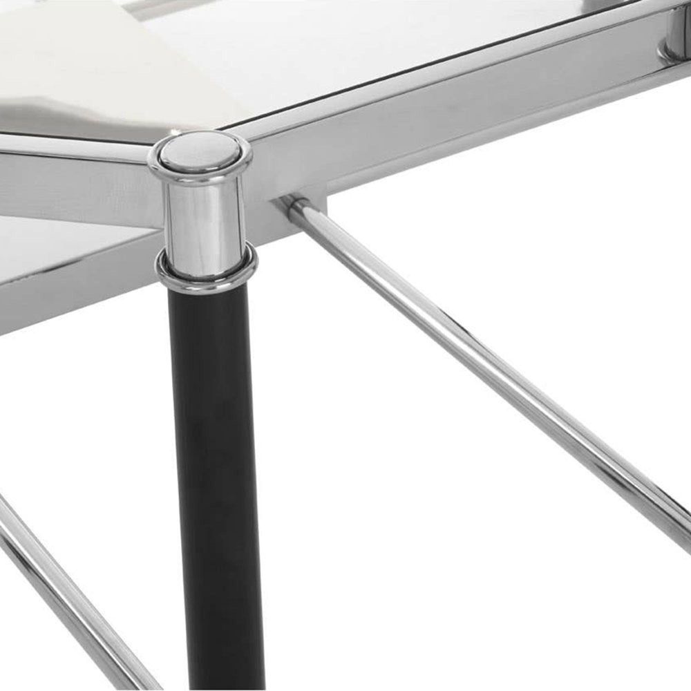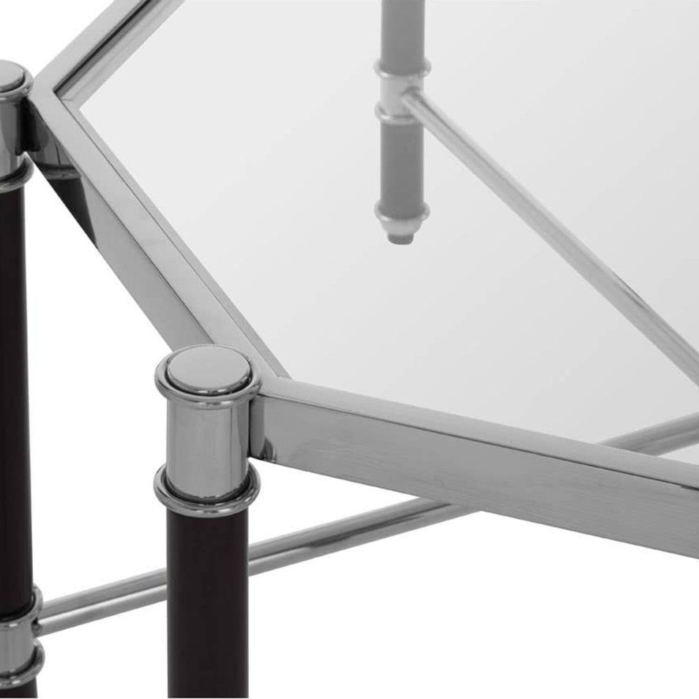 Item Code: 5527733 This abstract shape clear tempered glass placed neatly in this coffee table's stainless steel frame to complement most living decors.A pane of clear tempered glass is set into the table's octagonal frame. The frame is made from smooth stainless steel and has a reflective chrome finish. Its black legs are accented with chrome stainless steel clasps,and lines support a mirrored steel plate.
