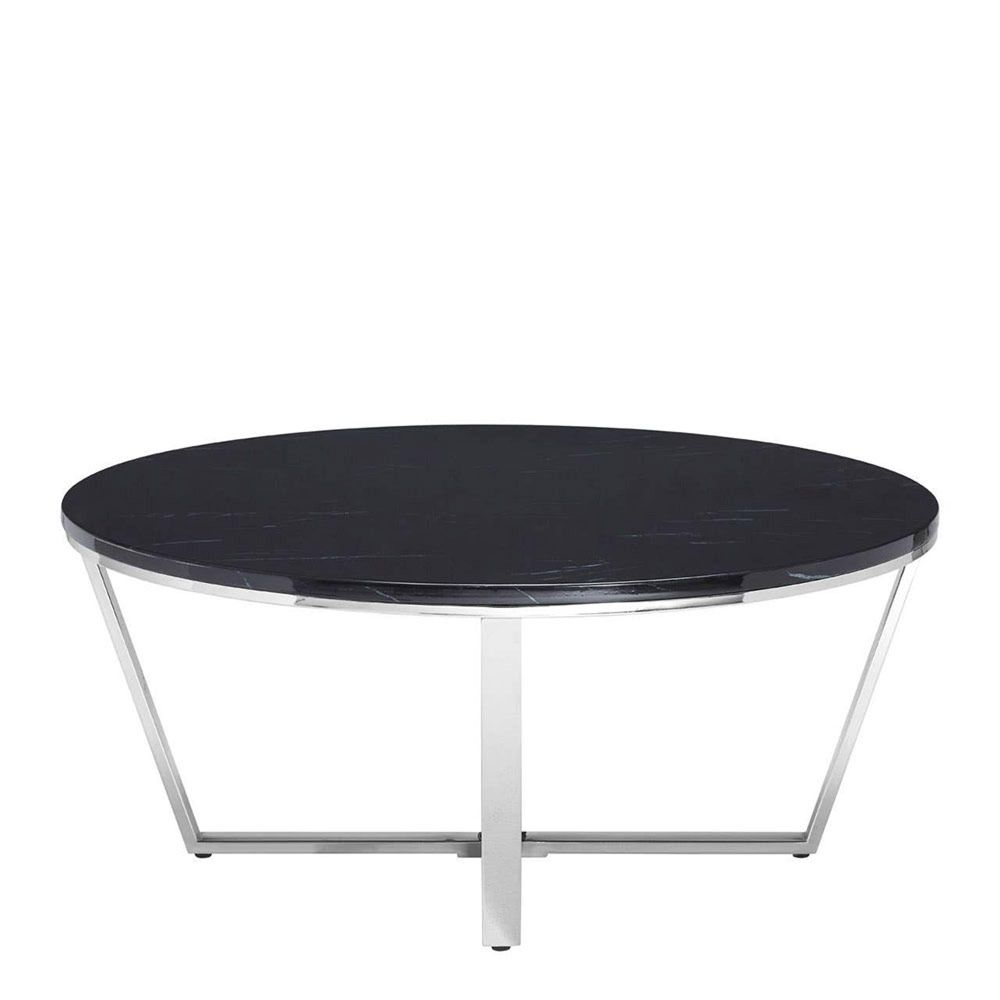 Item Code: 5501378 The Allure chrome metal coffee table features a black faux marble top.The Allure coffee table's round surface is made from faux marble with white veining detail offsetting the black. It rests upon a sliver of silver coloured metal that transitions into the angled metal legs. The simple lattice design at the base of the legs creates flow enhancing the allure of this luxurious boutique hotel style piece.