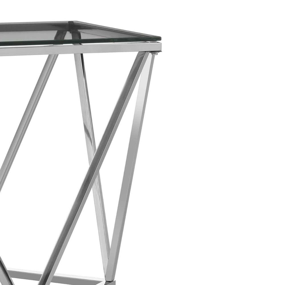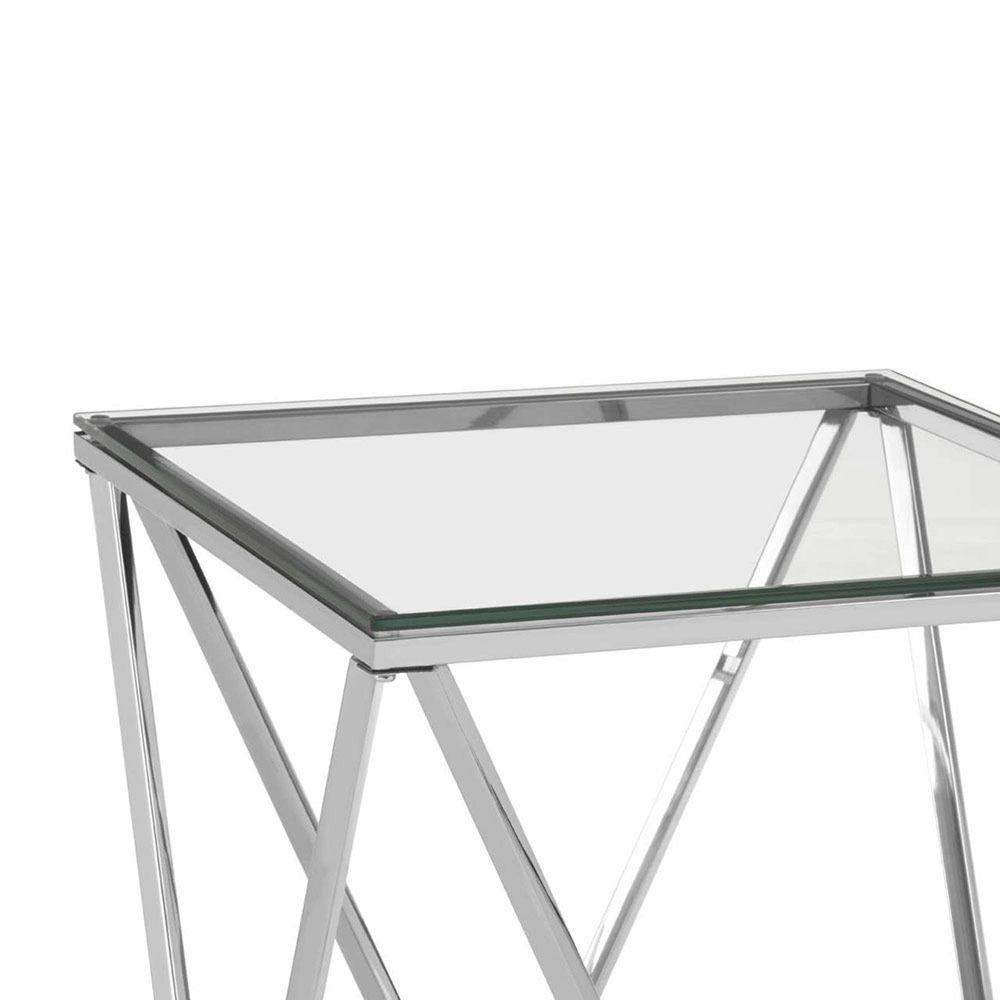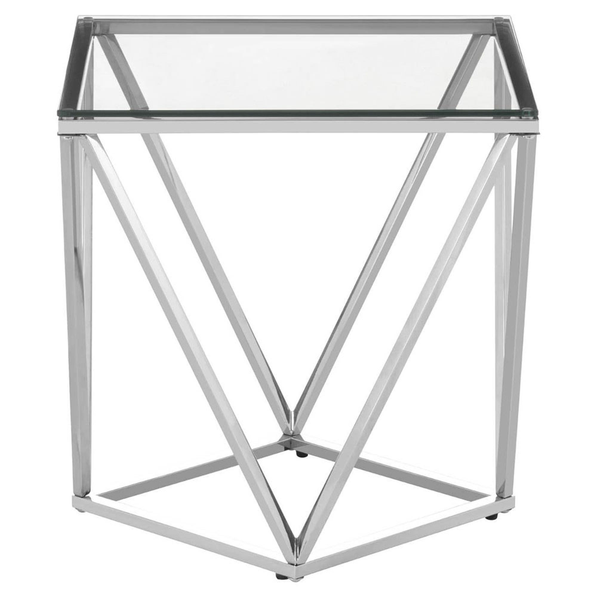 Item Code: 5502584 The top of this end table is crafted from silver metal frame and tempered glass. Style this luxe furniture piece with modern style decorThis stylish end table is composed of a series of straight lines configured to create a quirky twist design. Its distinctive frame is made from stainless steel and boasts a silver finish that complements reflective metallic accessories and textiles.