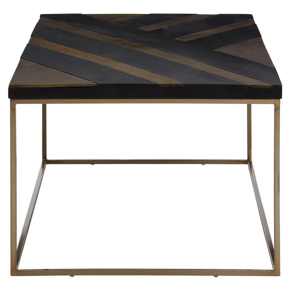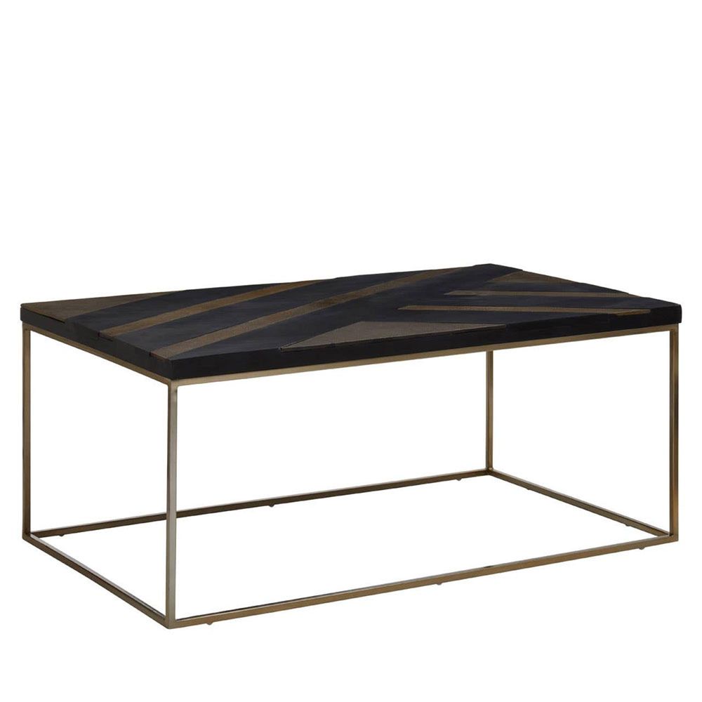 Item Code: 5529570 The Aris contemporary coffee table is crafted from acacia wood and offers a black and gold top resting above a sturdy sledge base. This sleek and modern coffee table made from acacia wood features a metallic black and gold finished table top with thick stripes based on a sturdy metal structure with interconnected legs.