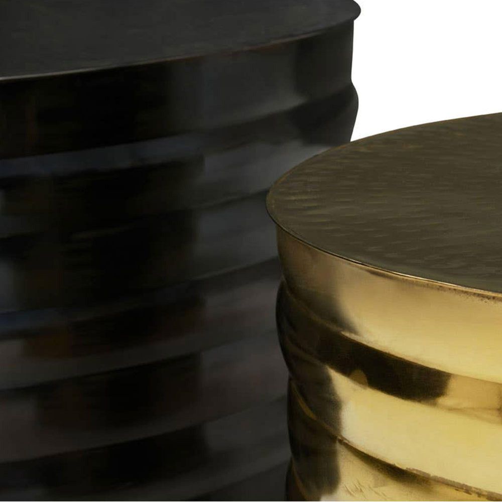 Item Code: 5528544 This set of two clean-lined round coffee tables will add practicality and geometric allure to the decor. Featuring a luxe and rustic flair, the textured surface of this table set adds depth and character to the area. Crafted from aluminium and given a black and brass finish, this set of two coffee tables blends well into industrial-inspired lounges.