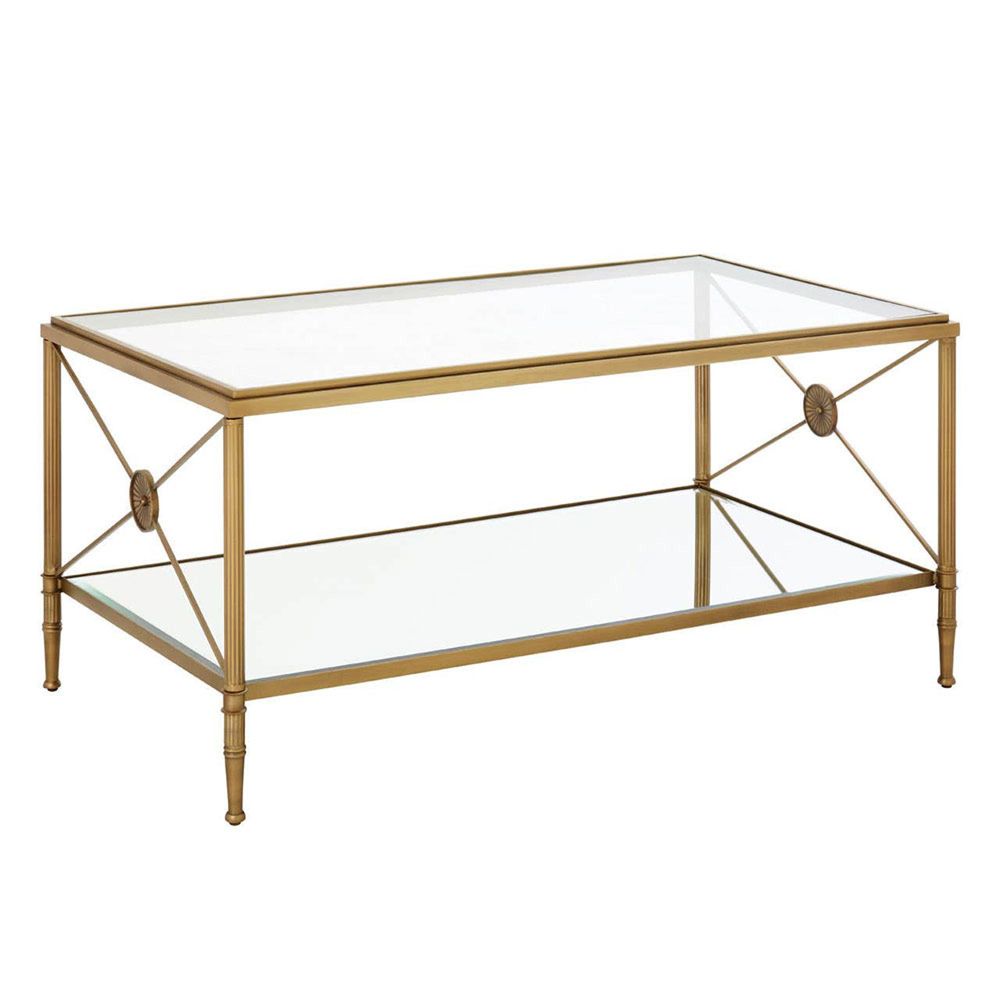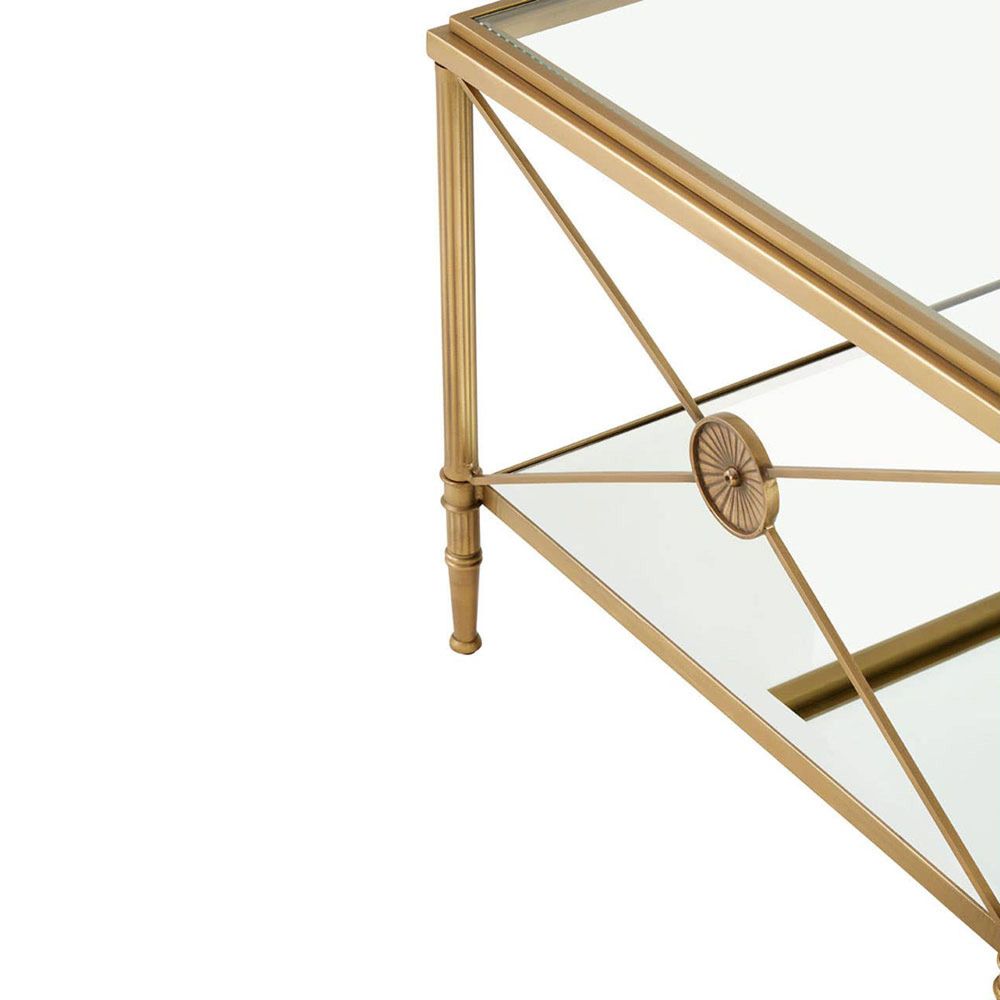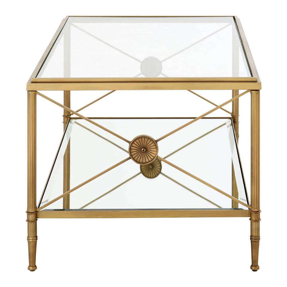 Item Code: 5502388 A mix of contemporary and classical design, this coffee table enhances architectural interest with x shaped sides. This coffee table has a rectangular metal frame in a tarnished brass finish adding to the antique effect. Supporting two-tier glass shelves, the frame features a cross design at each end which is connected with a floral motif.