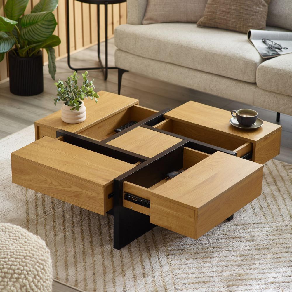 Item Code: TAH001 Designed to impress with a touch of geometric flair, this modern coffee table offers sharp lines and smart storage, with a beautiful, warm oak-effect finish. The smooth sliding top reveals four hidden compartments, each offering a discreet spot to keep everyday essentials close at hand but neatly out of sight. Once closed, the surface forms a seamless square desktop, ideal for displaying decor, holding drinks, or simply enjoying a clutter-free look. Balanced on a striking black cross-style base, it adds a contemporary edge while ensuring support. Self assembly required.