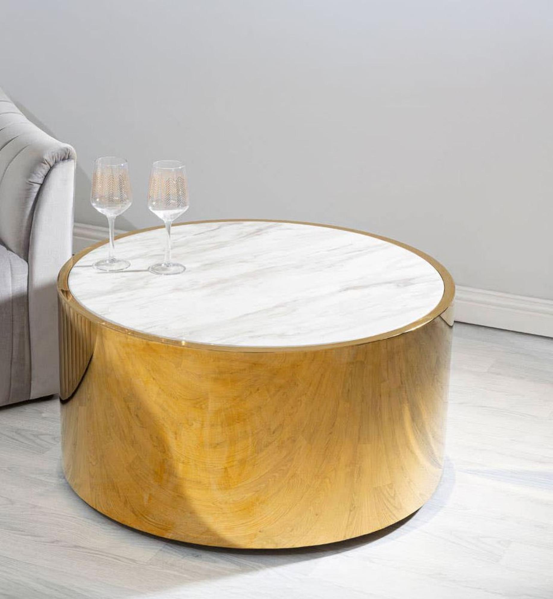 Item Code: 5527478 This drum style coffee table will make an elegant centrepiece with its luxe visual appeal and faux marble top.Made from stainless steel, this coffee table has a rounded base in warm metallic hues which gives the minimal design a touch of glam appeal. Faux marble top adds more sophistication to the design and softens the visual aesthetic.