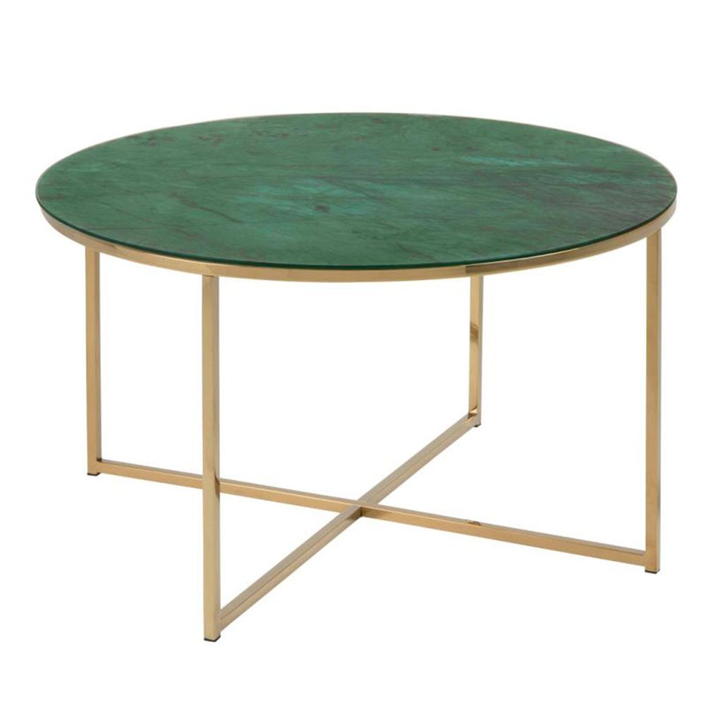Item Code: 77195 Alisma round coffee table top green Juniper tempered and frosted glass base gold chrome steel. This coffee table has a slightly opulent look that is everything but boring. The combination of a golden chrome base and a frosted glass tabletop with the all-time favourite matt green marble look brings excitement and energy to the room. Made of easy-care materials a glass cleaner and microfiber cloth will do just fine.Free Delivery