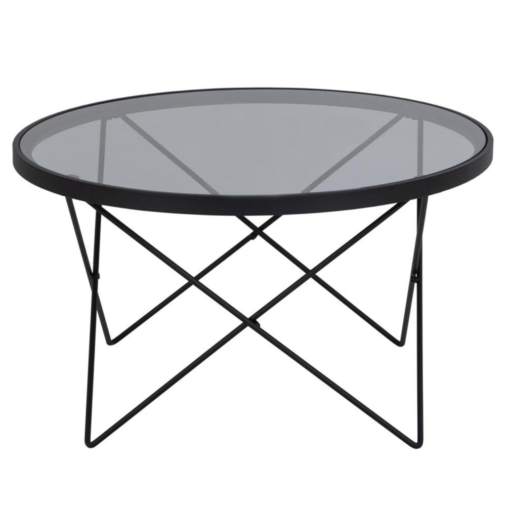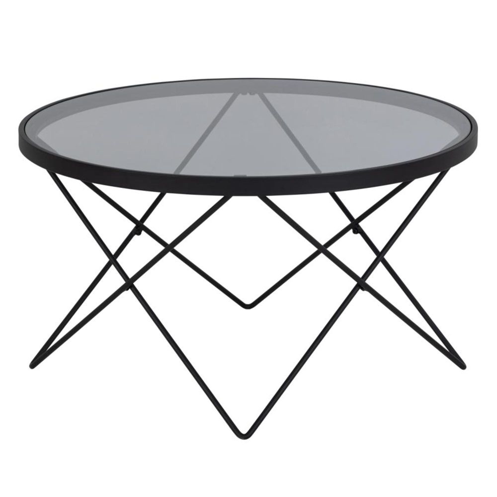 Item Code: 99111 Cuxton round coffee table top smoked tempered glass wire base matt black rough powder coated steel. When looking at this dark coffee table it is hard to resist its round tabletop and geometric base. With a smoked effect the tabletop made of tempered glass is just as pretty as it is sturdy. To make it more visually appealing it is completed with a slim base in black metal.Free Delivery
