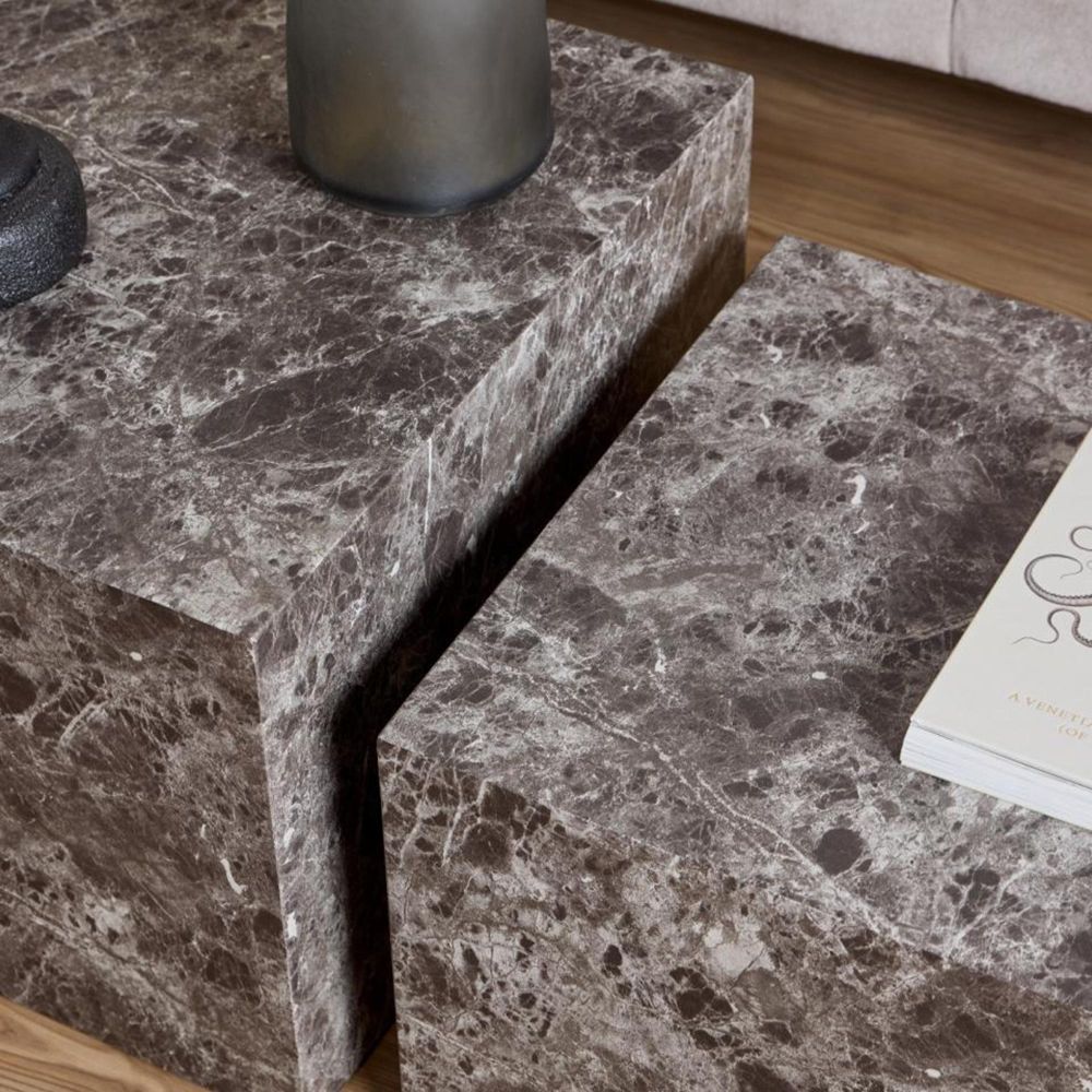 Item Code: 105535 Dice square coffee table set top and base light brown Emperador rough paper with set of 2 pcs. Ready to make a statement? Then let this coffee table set move into your living area. From the square form to the brown Emperador look these tables will for sure turn heads. Use them as a coffee table or place them in a corner with a big plant or vase to make the set stand out.Free Delivery