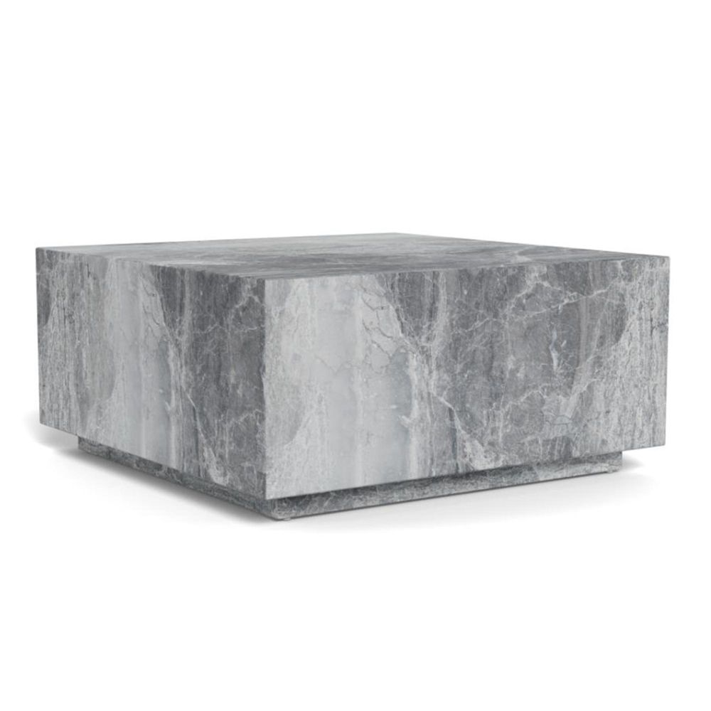 Item Code: 104953 Dice square coffee table top and pillar base grey marble River rough paper. Ready to make a statement? Then this square coffee table is perfect for you. The grey marble look adds a modern feel to the table and notice how the subtle low base lends the table an architectural touch. This table offers lots of surface for a stack of books and drinks and snacks during your next get-together.Free Delivery