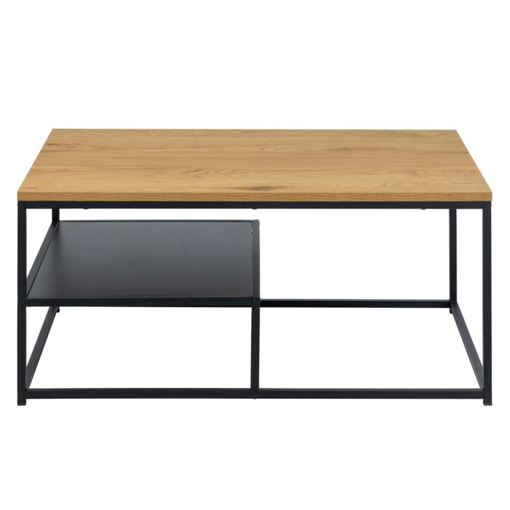Item Code: 102167 Gila rectangular coffee table top matt wild oak rough melamine shelf black rough melamine base matt black rough powder coated steel with asymmetrical detail. A modern chic and practical coffee table You got it. Due to the melamine in wild oak look the tabletop has an easy-care surface and is easy to wipe clean. The combination of wild oak look and powder coated steel base gives the table a powerful look. The square metal base also ensures sturdiness. Use the shelf as a place for small storage such as magazines remotes bits and bobs.Free Delivery