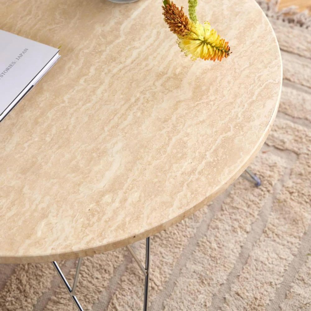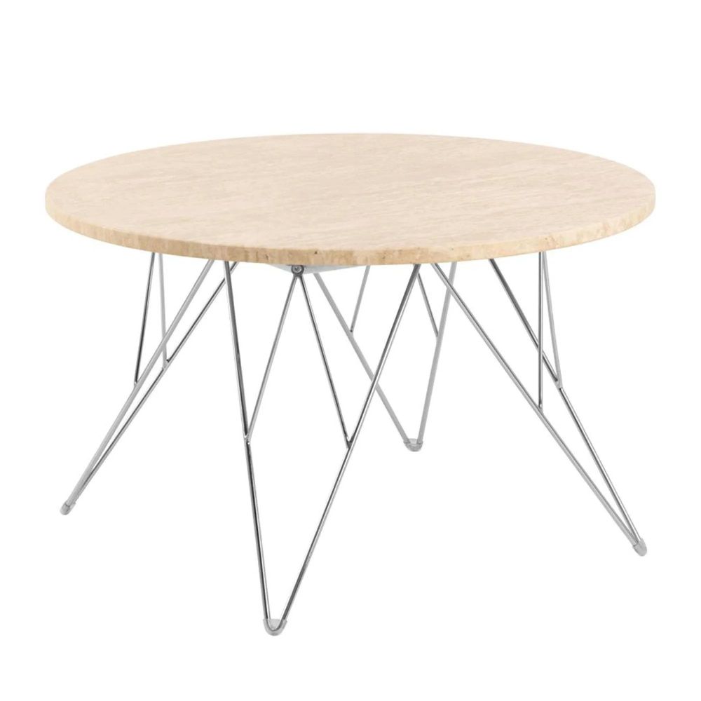 Item Code: H000023715 Prunus round coffee table, top matt beige lacquered travertine, wire base chrome steel. This coffee table will appeal to both minimalists and maximalists alike. It boasts a visually striking travertine top that is supported by a chromed wire base. The balanced contrast between proportions lends a light-hearted charm to the design. It easily adapts to all kinds of interior styles.Free Delivery